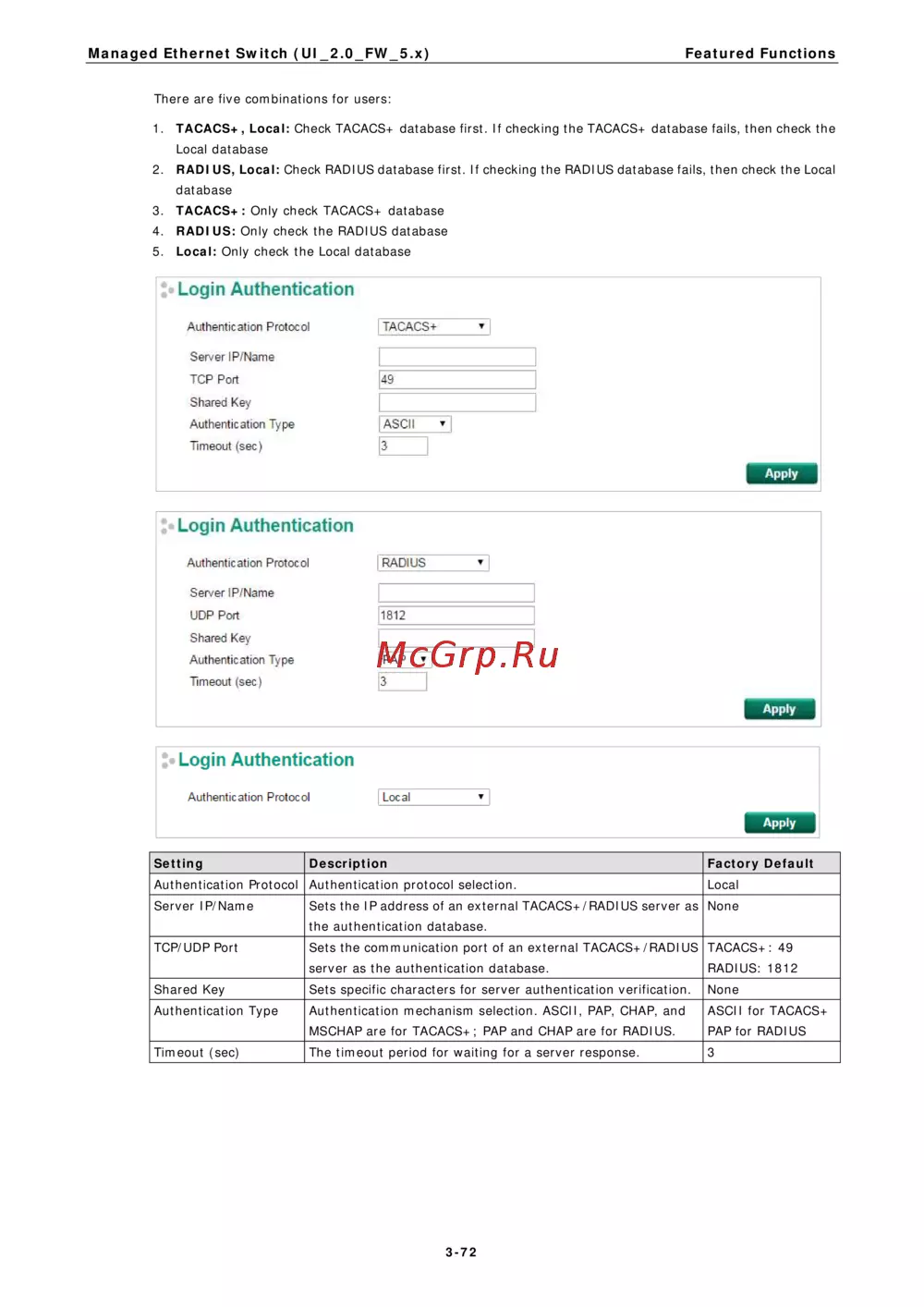 1. TACACS+, Local: Check TACACS+ database first. If checking the TACACS+ database fails, then check the