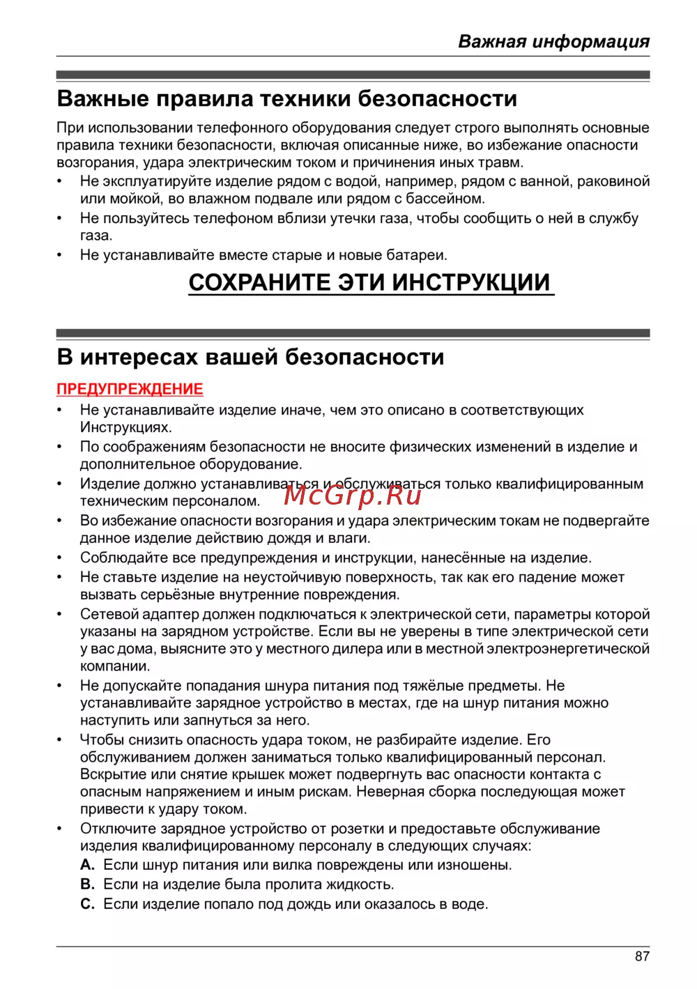 Panasonic KX-TCA275 — основные правила техники безопасности при использовании оборудования [87/98]