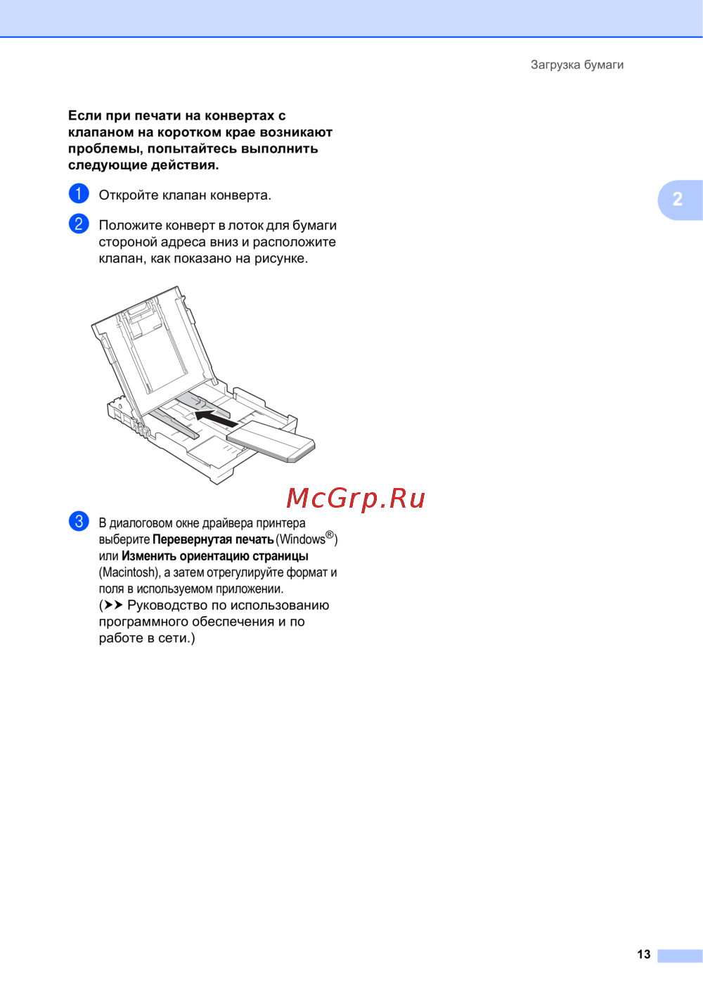 b Положите конверт в лоток для бумаги