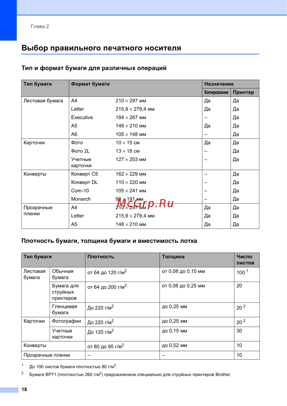 Плотность бумаги, толщина бумаги и вместимость лотка 2