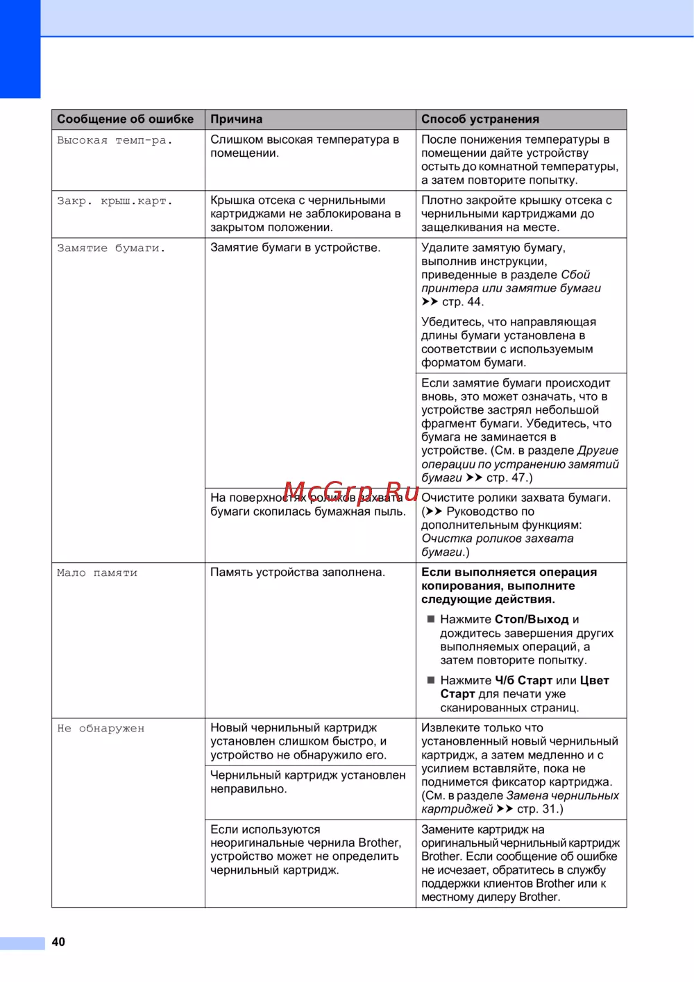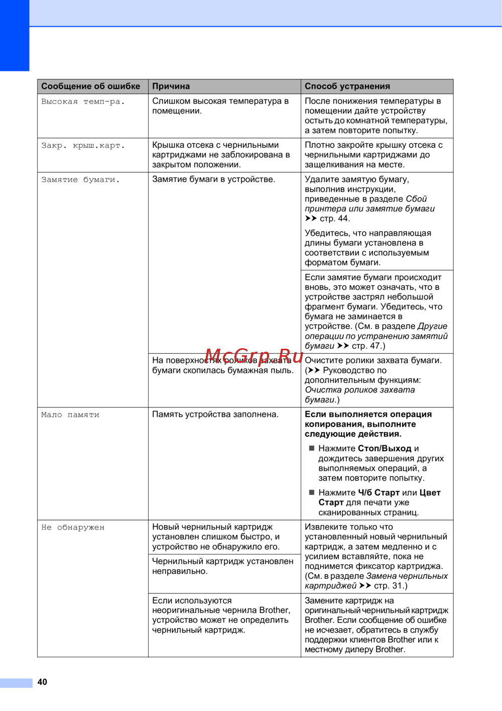 - Если требуется дополнительная помощь на веб сайте brother solutions center можно прочитать ответы на часто задаваемые вопросы и рекомендации по устранению неисправностей p.60