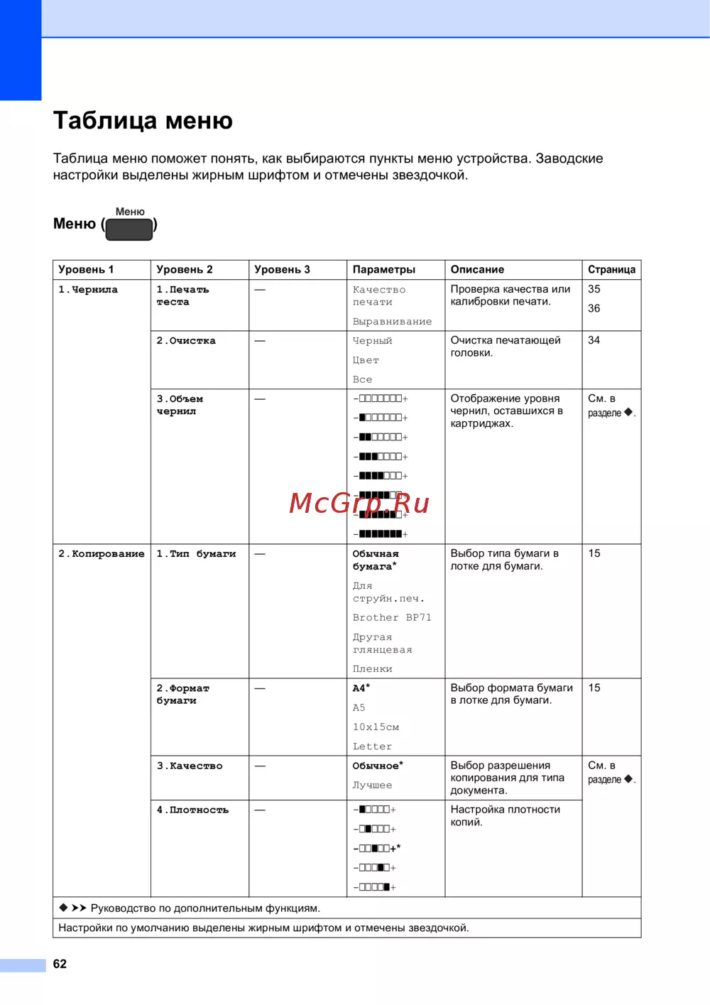 ![Brother DCP-J100 [70/91] Таблица меню поможет понять как выбираются пункты меню устройства заводские настройки выделены жирным шрифтом и отмечены звездочкой](/views2/1198930/page70/bg46.png)