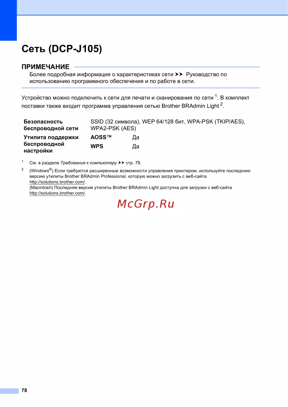 поставки также входит программа управления сетью Brother BRAdmin Light