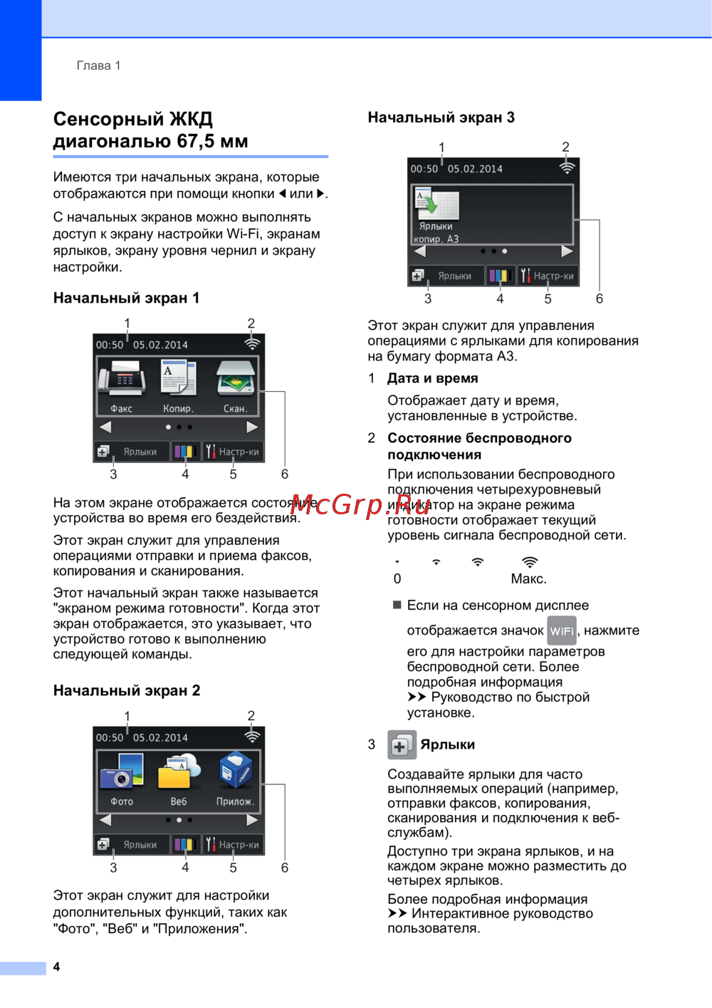 Изучите функциональность сенсорного ЖКД и начальных экранов, включая управление факсами, копированием и настройками Wi-Fi. Узнайте о ярлыках и их использовании.