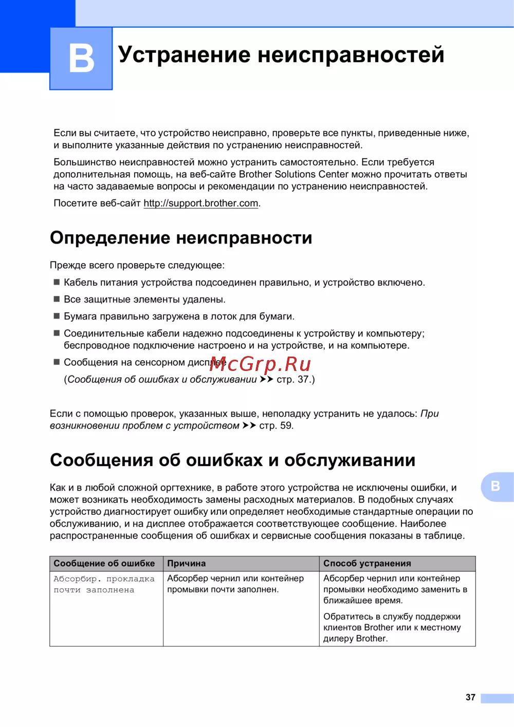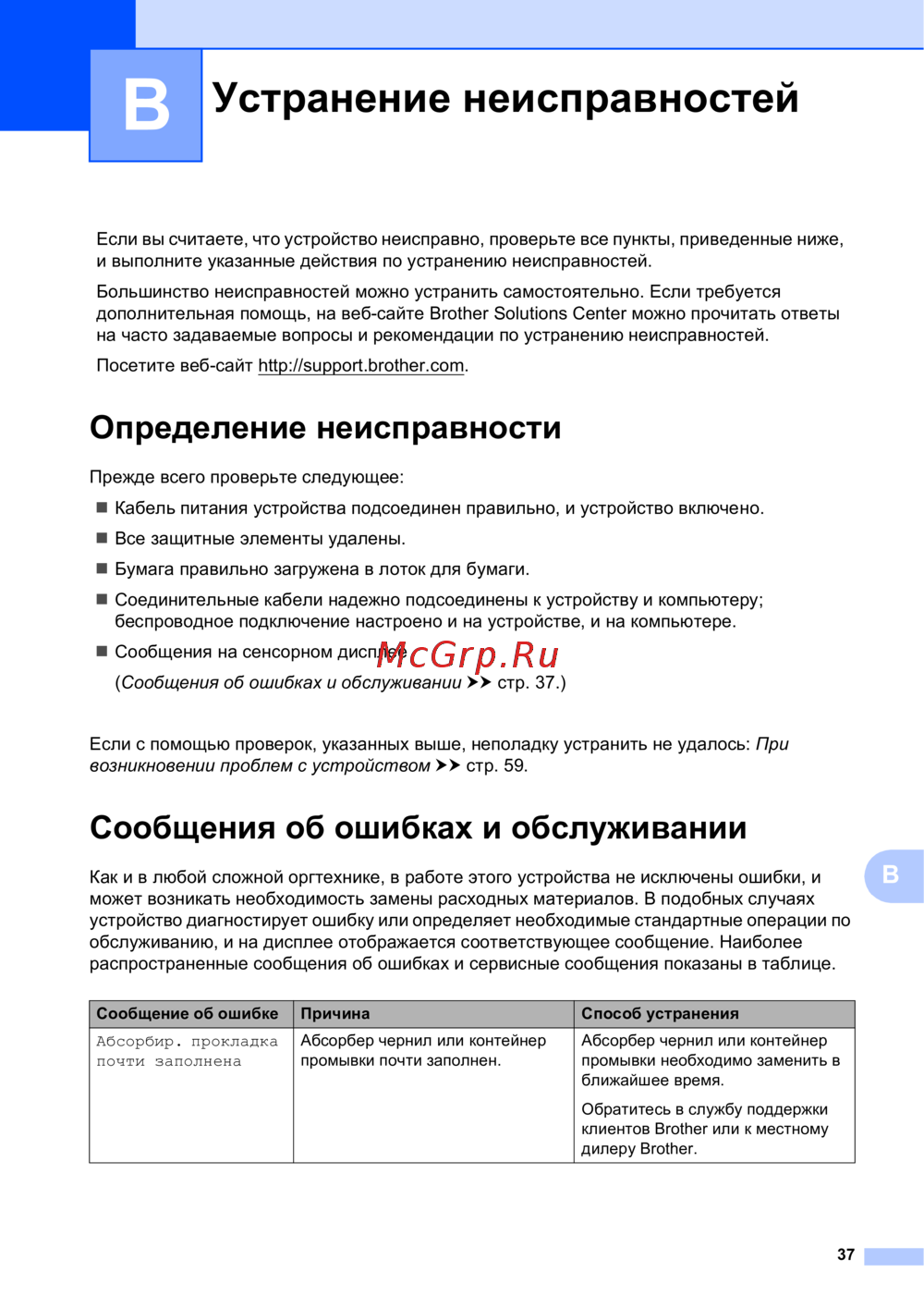 (Сообщения об ошибках и обслуживании uu стр. 37.)