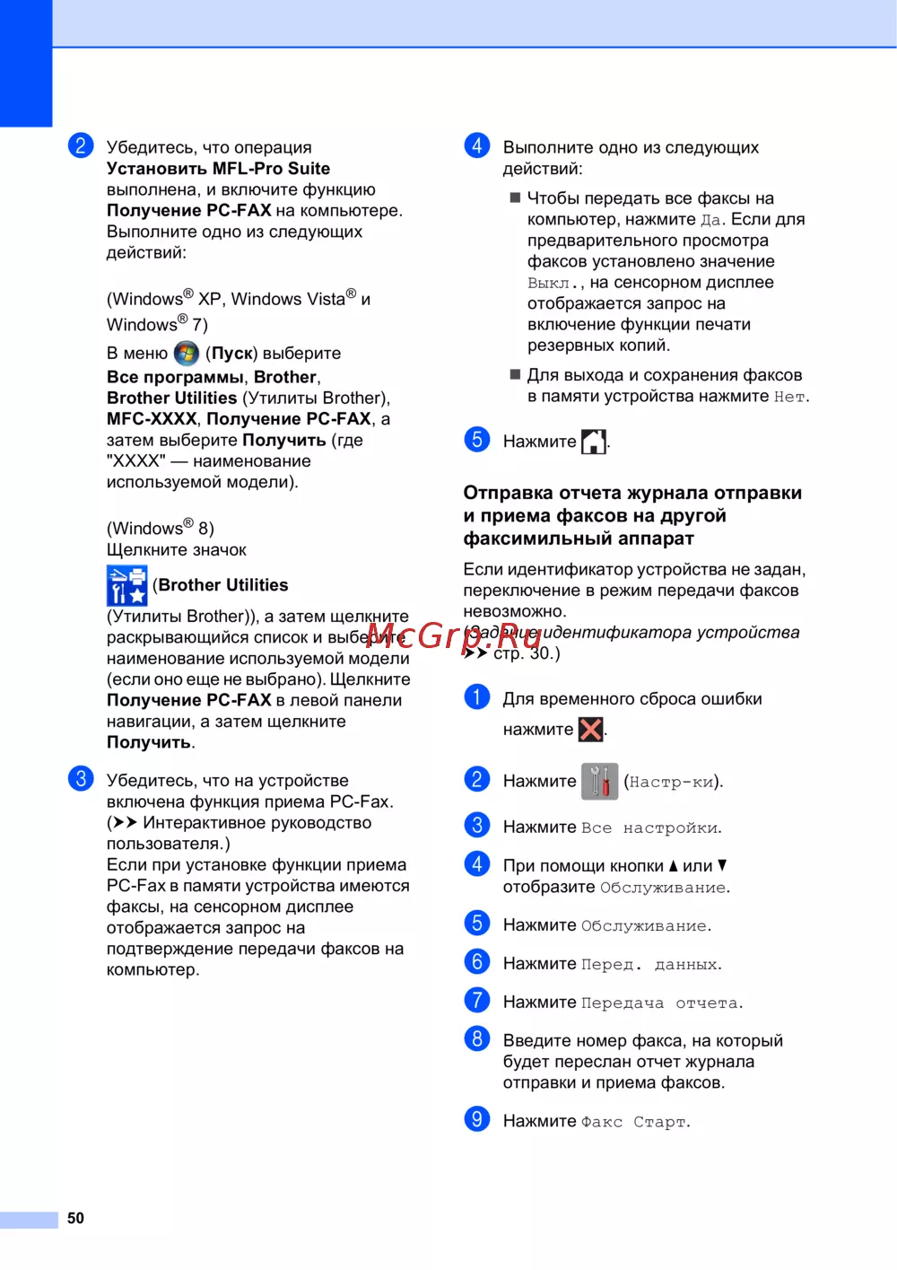 - Отправка отчета журнала отправки и приема факсов на другой факсимильный аппарат p.58