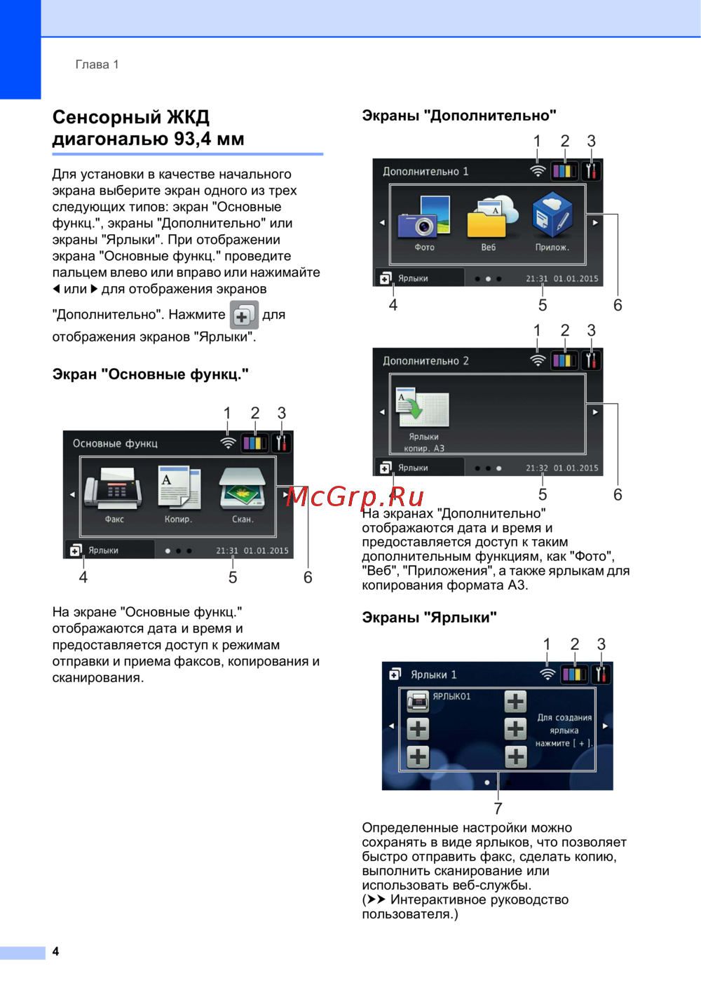 Узнайте, как настроить и использовать сенсорный ЖКД для отправки факсов, копирования и сканирования. Доступ к основным и дополнительным функциям в одном месте.