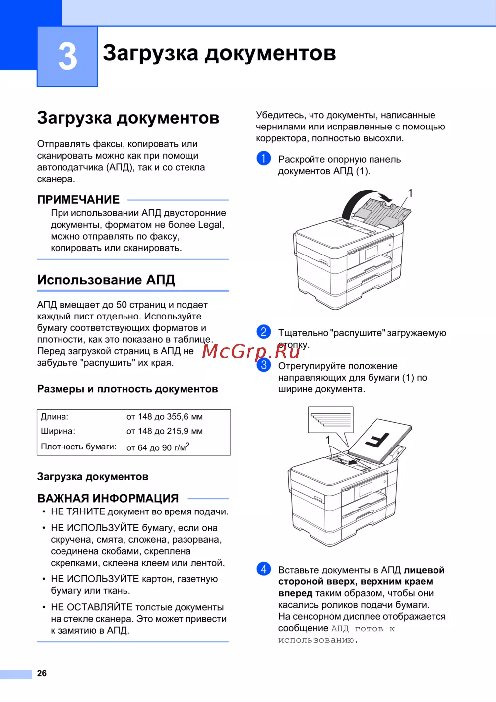 Инструкция по загрузке документов в автоматический податчик и со стекла сканера. Рекомендации по формату, плотности и подготовке бумаги для корректной работы.