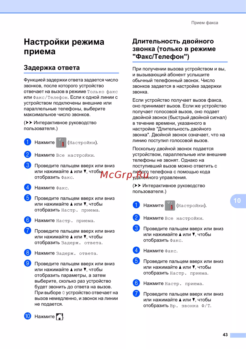 Узнайте, как настроить режим приема факса, включая задержку ответа и параметры двойного звонка. Оптимизируйте работу устройства для удобства.