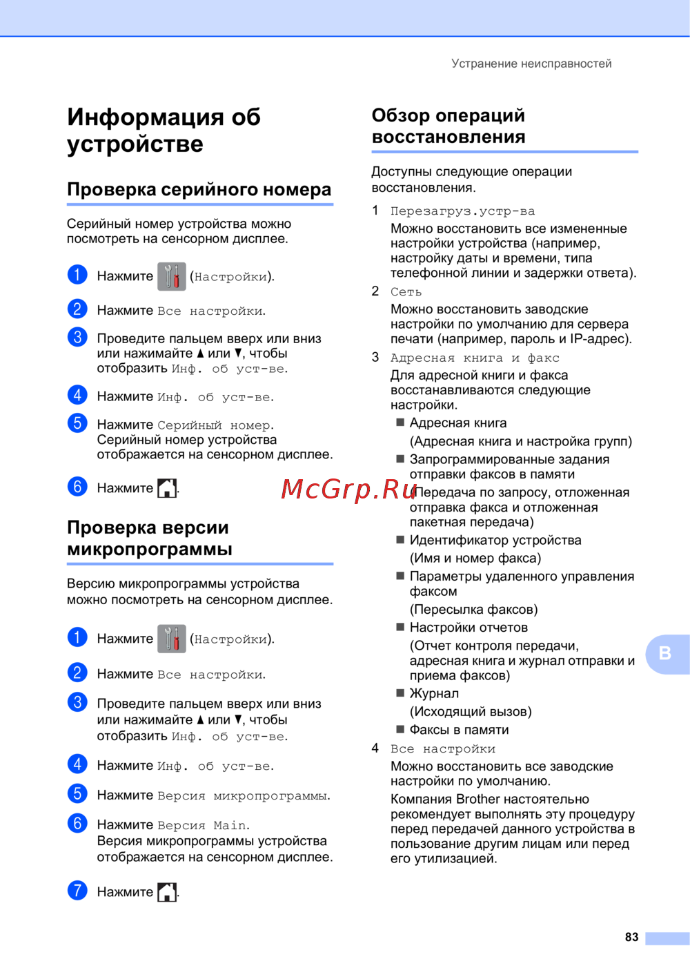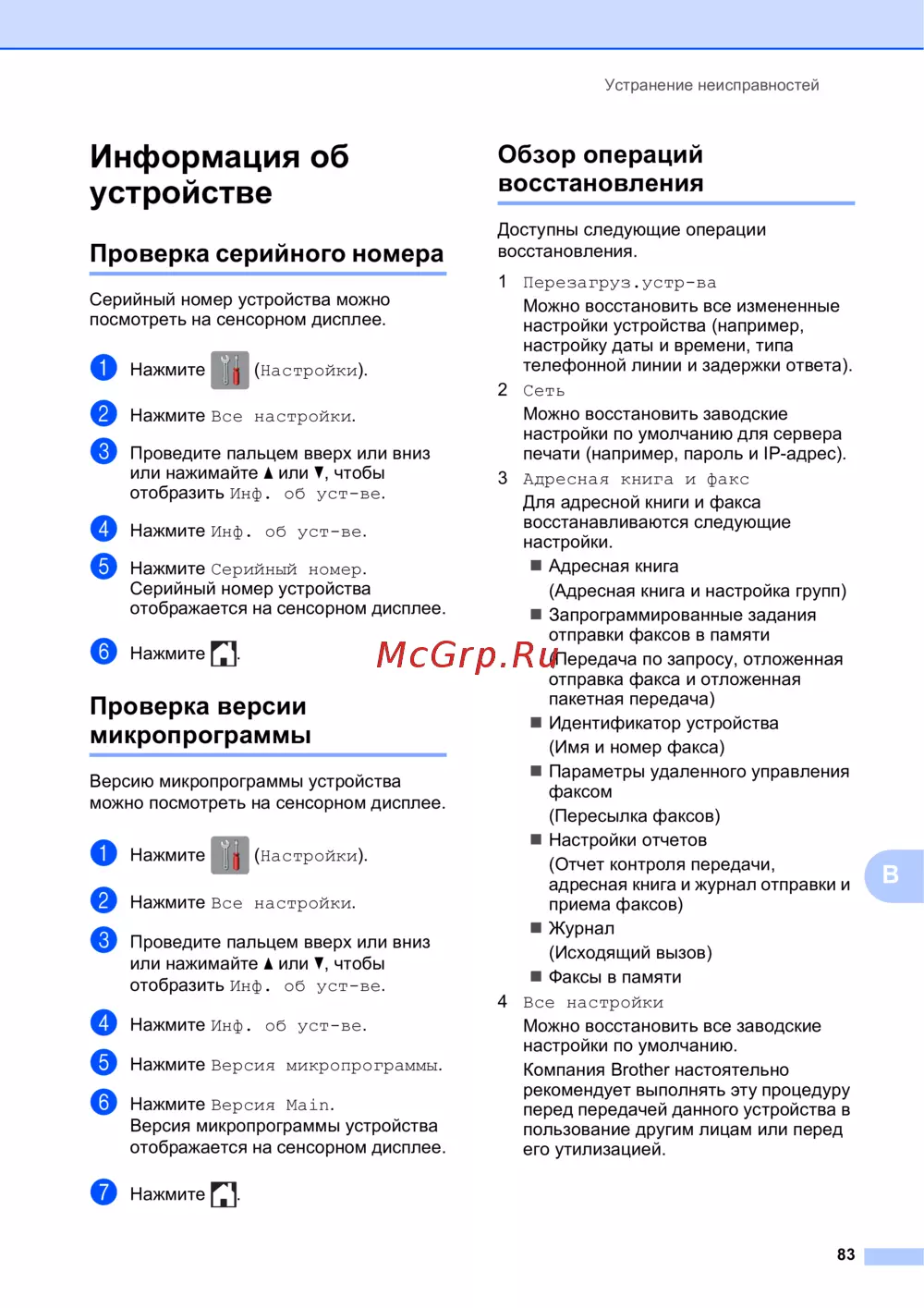 Узнайте, как проверить серийный номер и версию микропрограммы устройства. Ознакомьтесь с процедурами восстановления настроек для оптимальной работы.