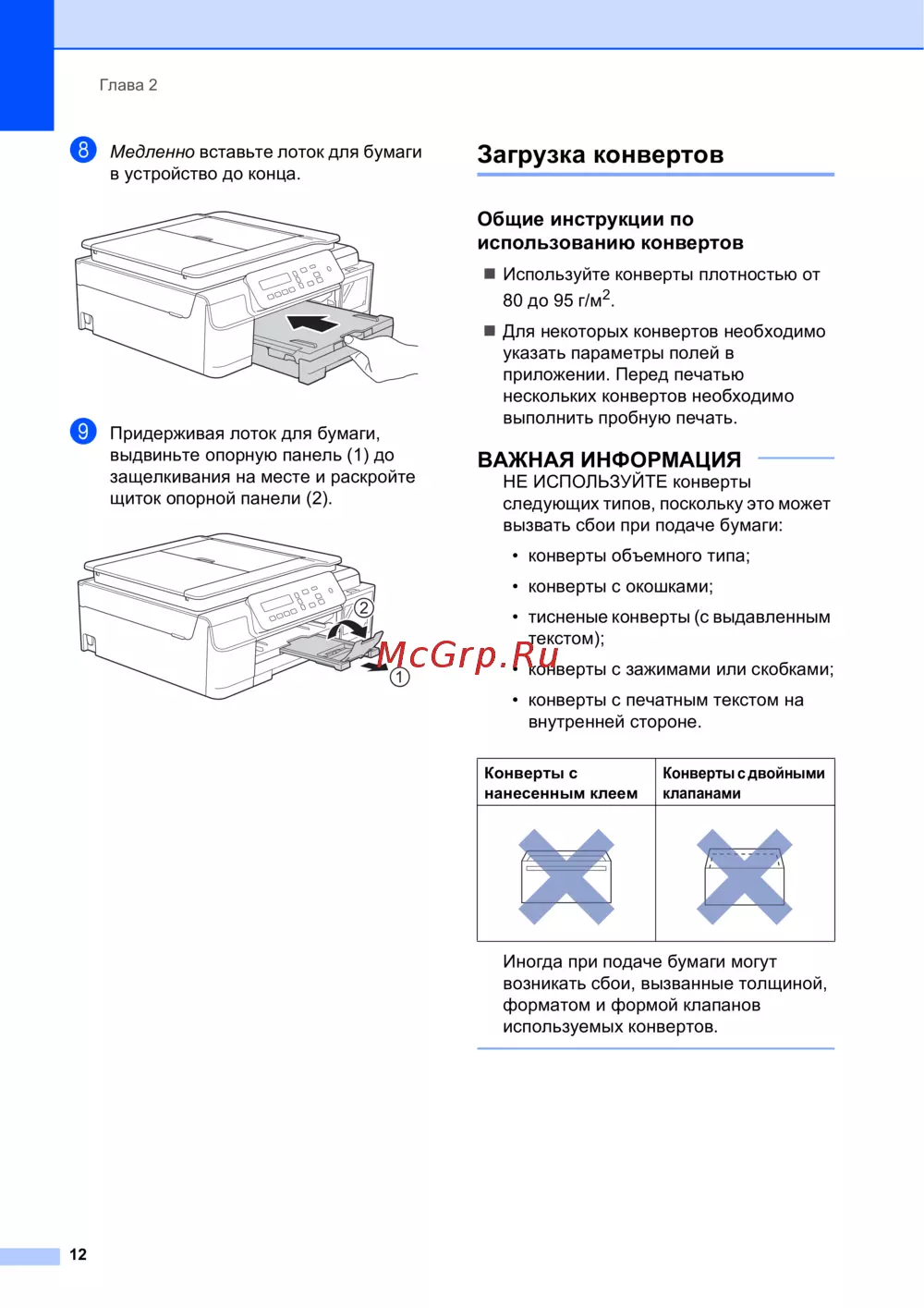 Узнайте, как правильно загружать конверты в устройство, чтобы избежать сбоев. Следуйте рекомендациям по типам конвертов и настройкам перед печатью.