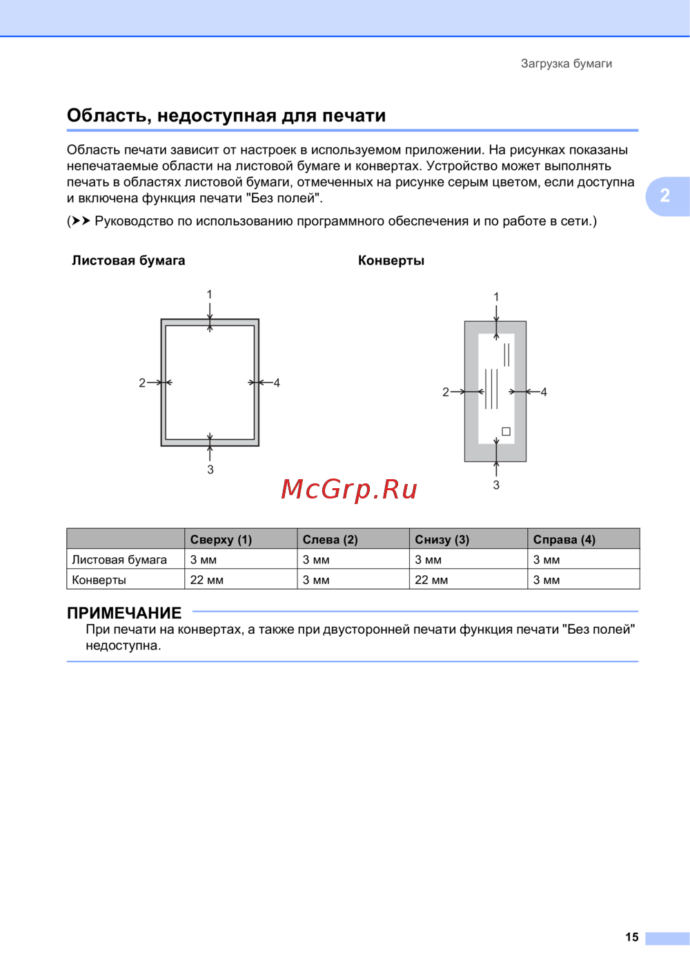 непечатаемые области на листовой бумаге и конвертах. Устройство может выполнять