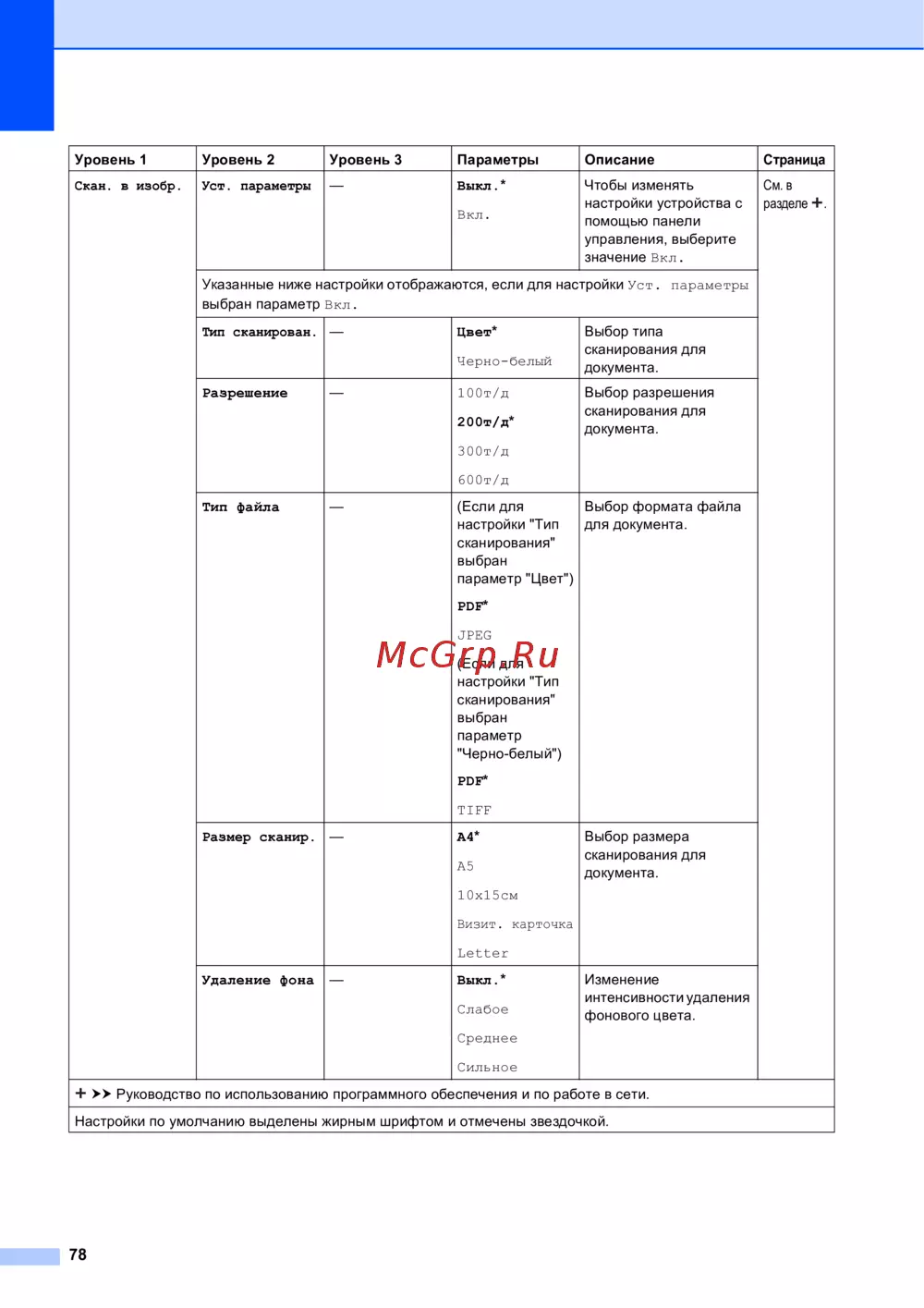 - Таблица меню поможет понять как выбираются пункты меню устройства заводские настройки выделены жирным шрифтом и отмечены звездочкой p.78
