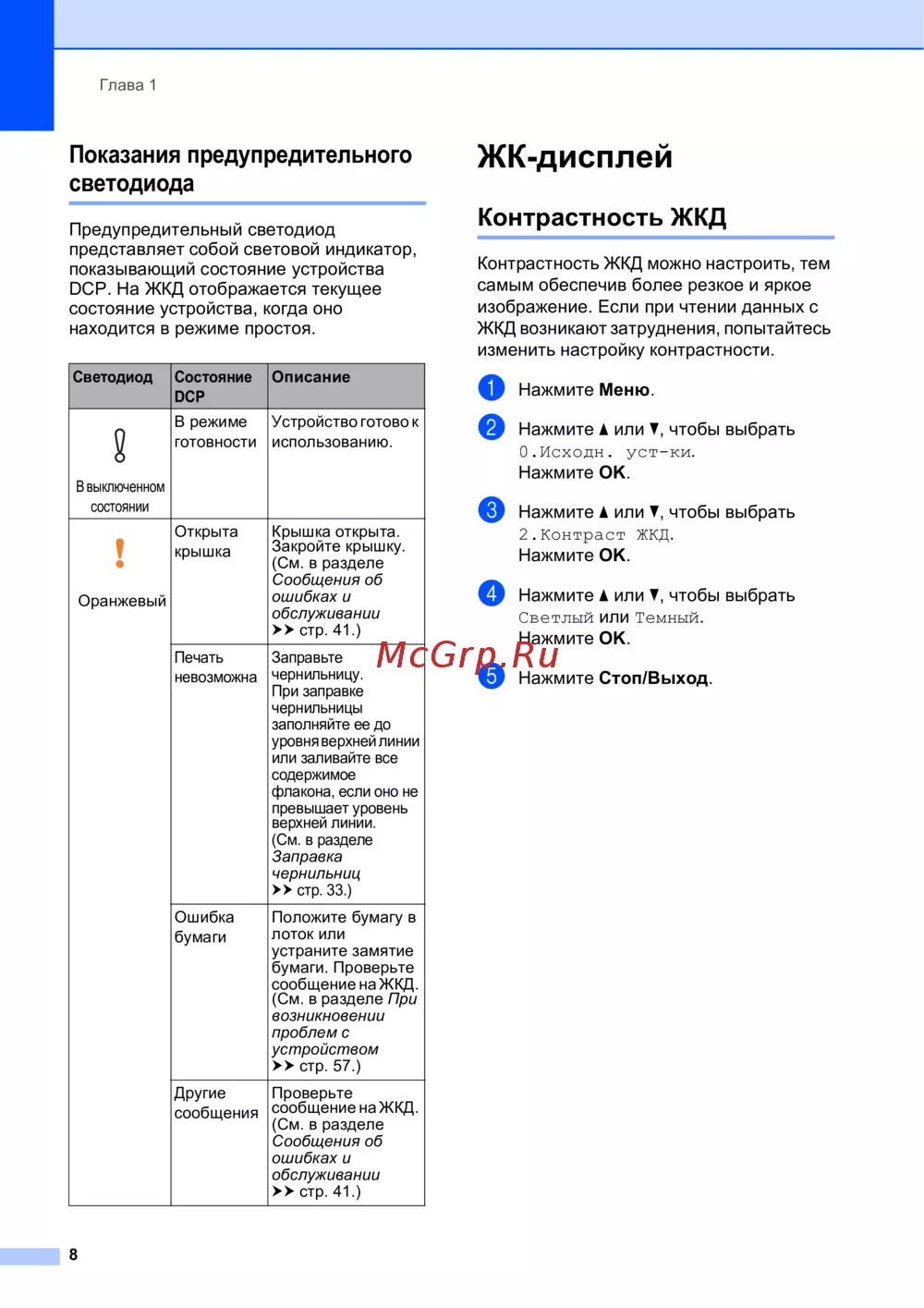 Узнайте, как настроить контрастность ЖК-дисплея и интерпретировать сигналы светодиода. Полезные советы по устранению ошибок и обслуживанию устройства.
