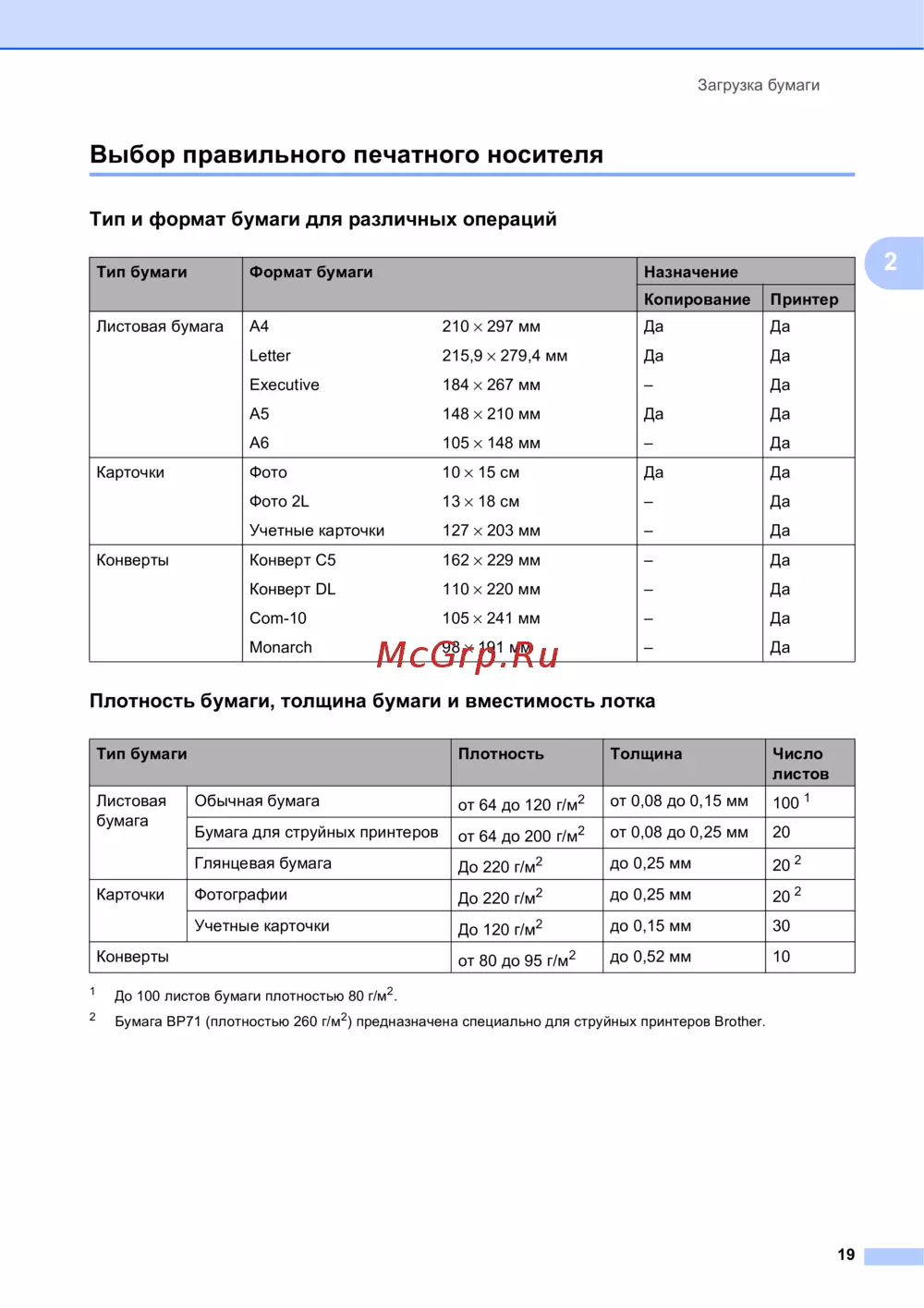 Плотность бумаги, толщина бумаги и вместимость лотка 2