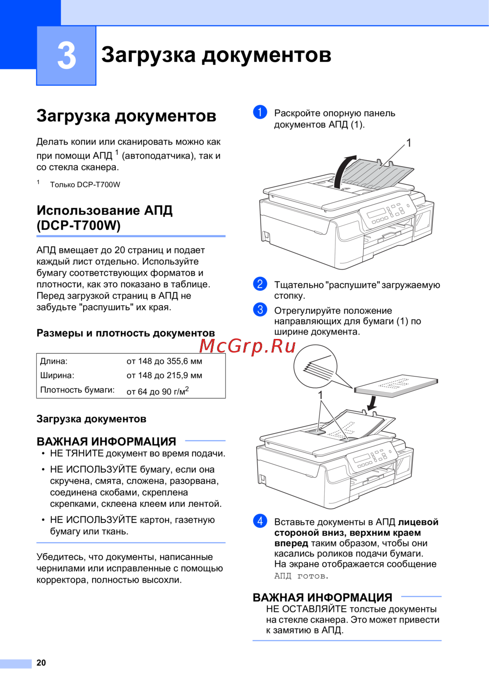 Узнайте, как правильно загружать документы в автоподатчик и сканер. Следуйте рекомендациям по формату и плотности бумаги для качественной работы устройства.