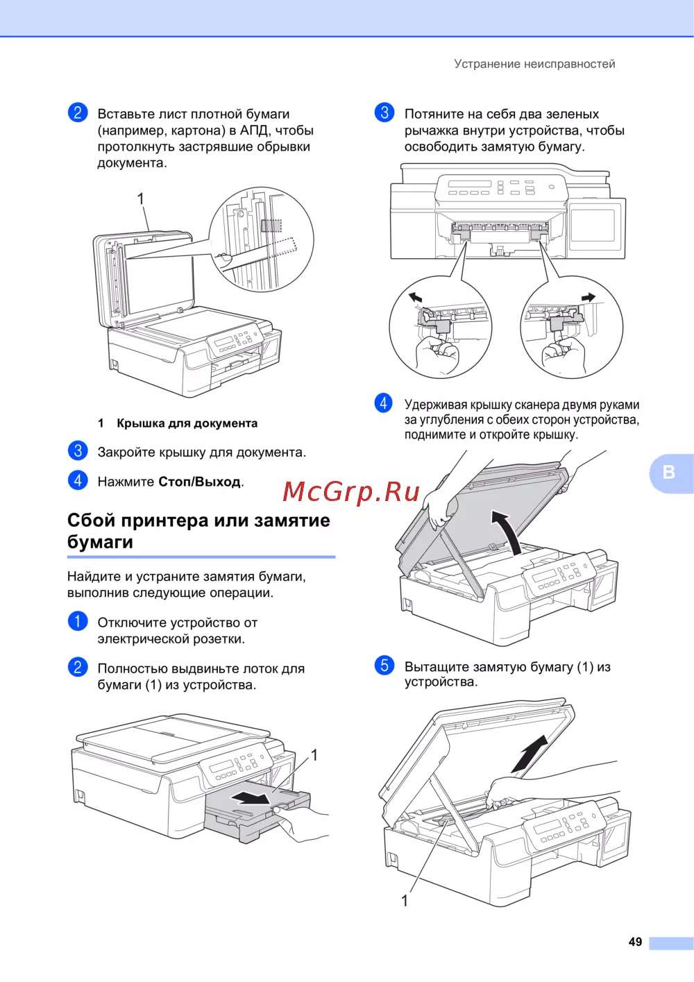 Подробная инструкция по устранению замятий бумаги и других сбоев в работе принтера. Пошаговое руководство по извлечению застрявшей бумаги и возобновлению печати.