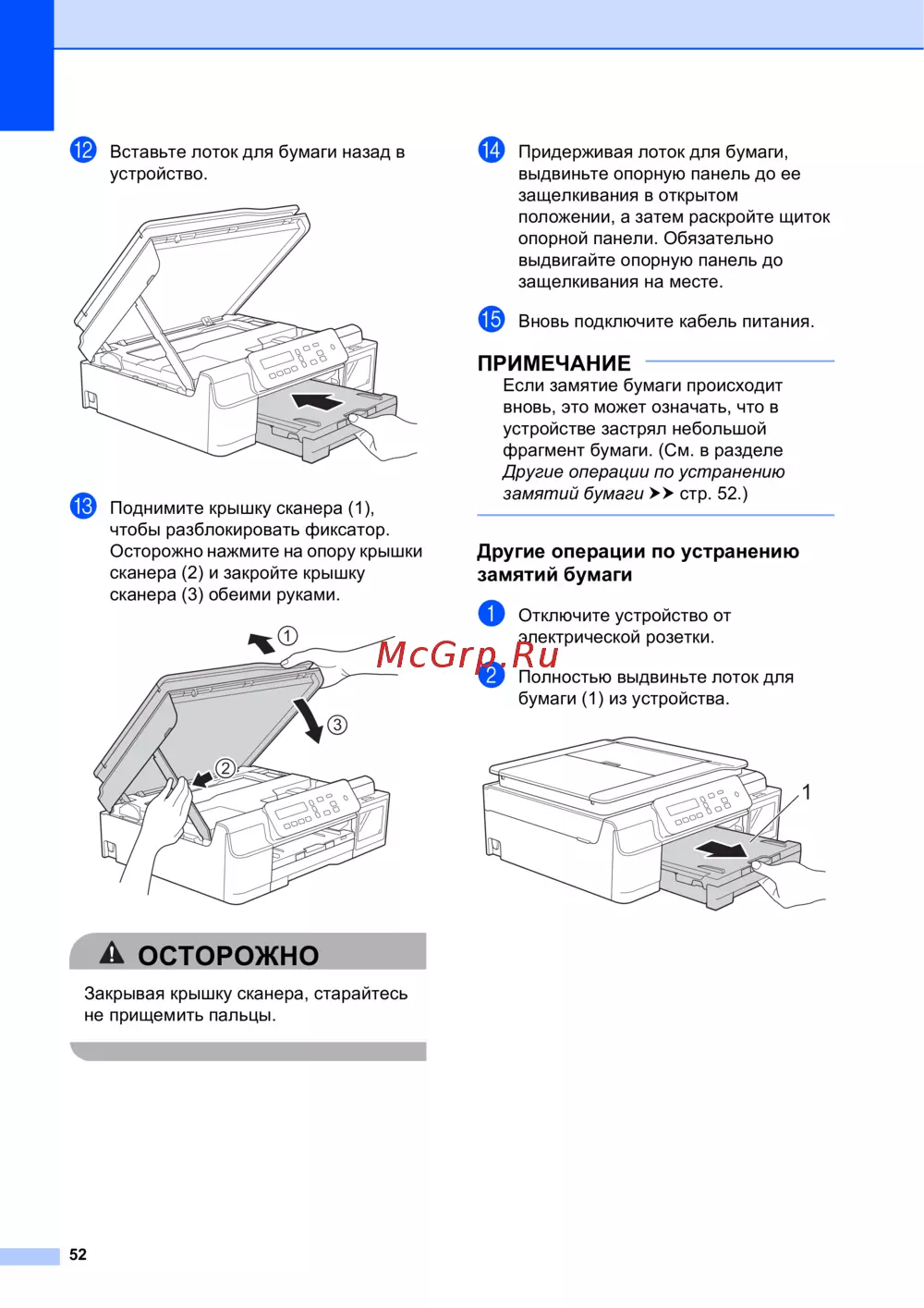 Узнайте, как правильно вставить лоток для бумаги и устранить замятия. Следуйте простым шагам для безопасного использования сканера и предотвращения проблем.