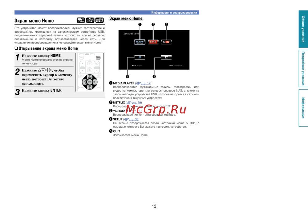 Изучите, как использовать меню Home для воспроизведения музыки, фотографий и видео с USB-устройств и сетевых серверов. Легкие шаги для настройки.