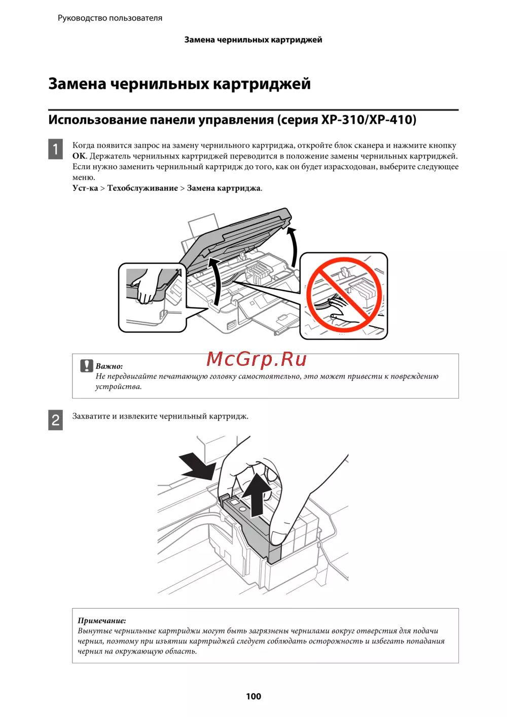 чернил, поэтому при изъятии картриджей следует соблюдать осторожность и избегать попадания