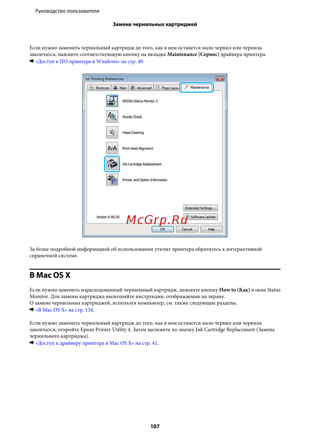 закончатся, откройте Epson Printer Utility 4. Затем щелкните по значку Ink Cartridge Replacement (Замена
