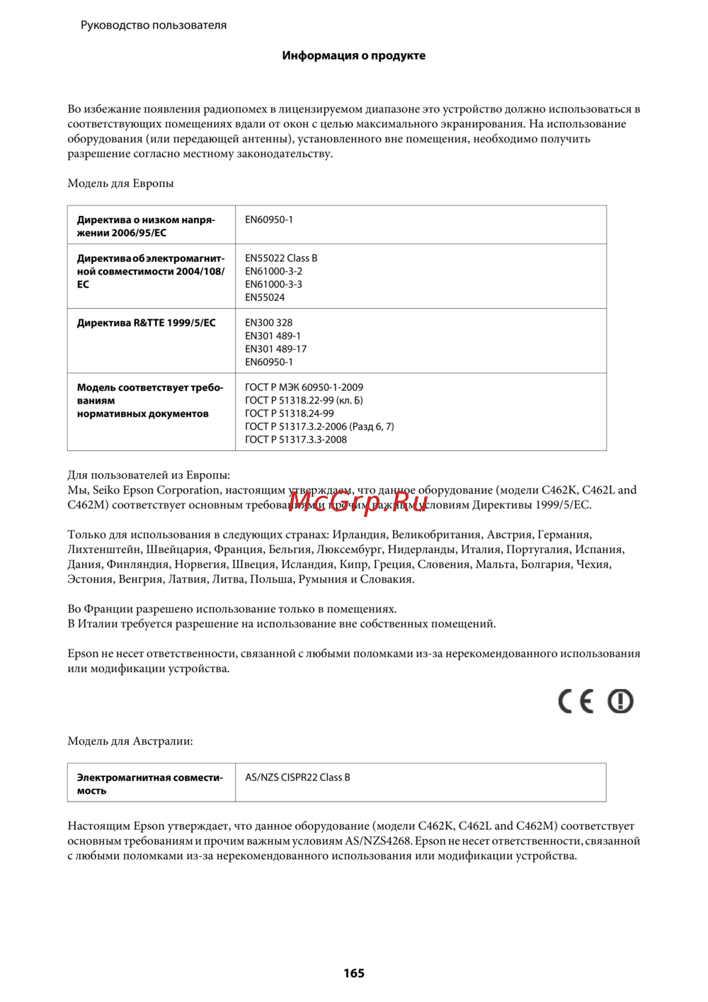- Настоящим epson утверждает что данное оборудование модели c462k c462l and c462m соответствует основным требованиям и прочим важным условиям as nzs4268 epson не несет ответственности связанной с любыми поломками из за нерекомендованного использования или модификации устройства p.165