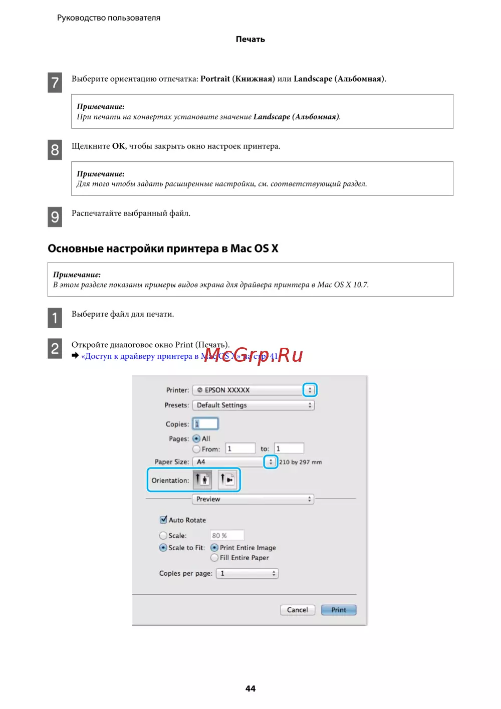 Epson Expression Home XP-313 — настройки печати на Mac OS X: Ориентация и параметры [44/175]