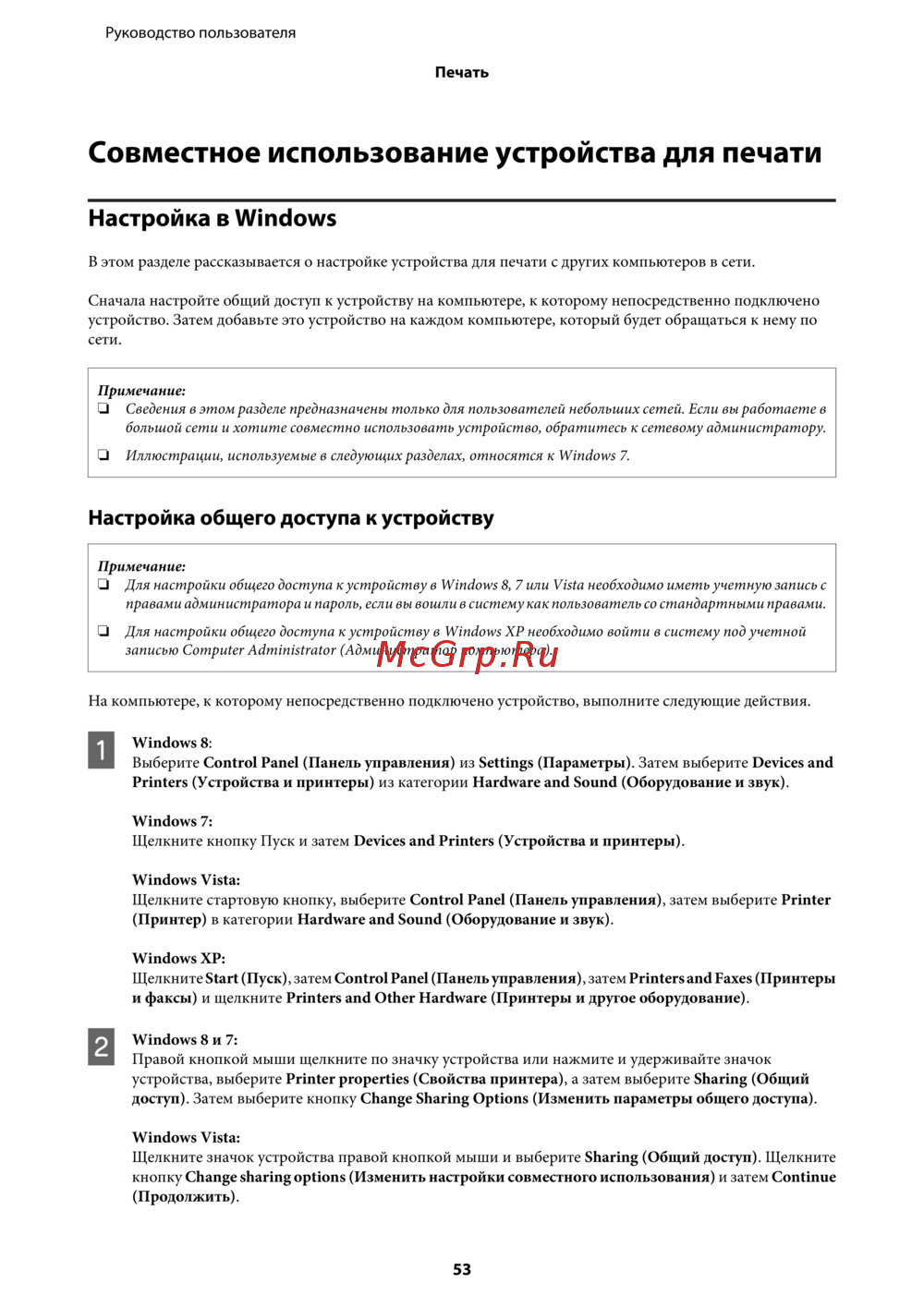 ❏ Для настройки общего доступа к устройству в Windows 8, 7 или Vista необходимо иметь учетную запись с