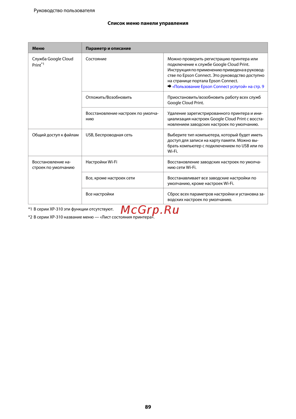 *2 В серии XP-310 название меню — «Лист состояния принтера».