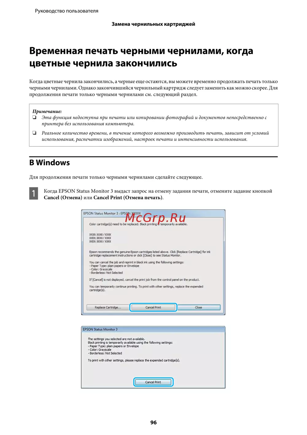 продолжения печати только черными чернилами см. следующий раздел.