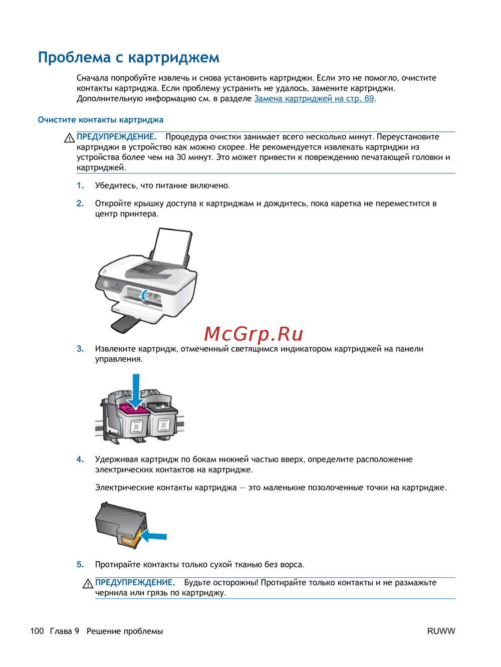 контакты картриджа. Если проблему устранить не удалось, замените картриджи.