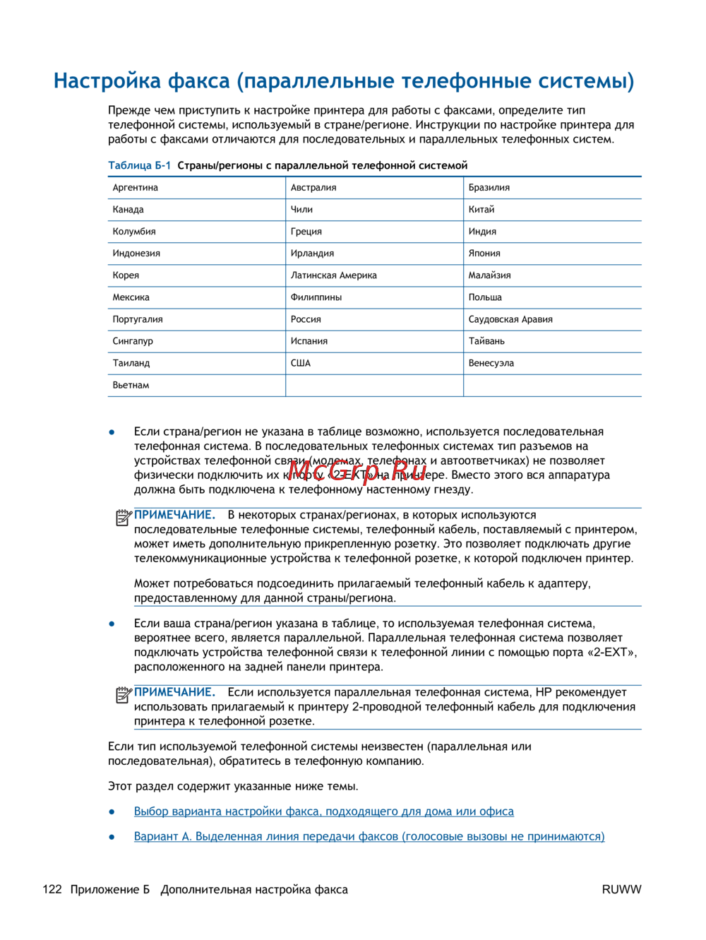 ПРИМЕЧАНИЕ. Если используется параллельная телефонная система, HP рекомендует