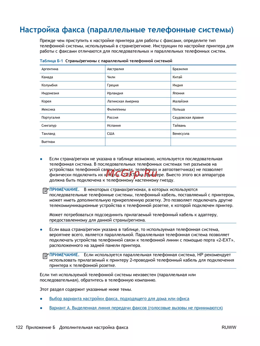 - Дополнительную информацию о настройке факса для работы с использованием последовательной телефонной системы см на веб сайте настройки факса для своей страны региона p.152
