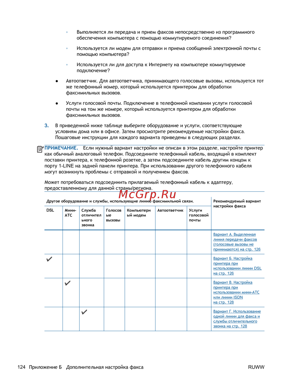 - В приведенной ниже таблице выберите оборудование и услуги соответствующие условиям дома или в офисе затем просмотрите рекомендуемые настройки факса пошаговые инструкции для каждого варианта приведены в следующих разделах p.128