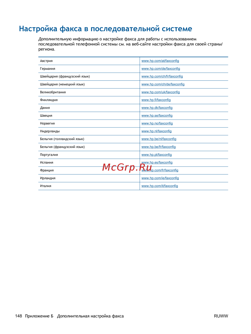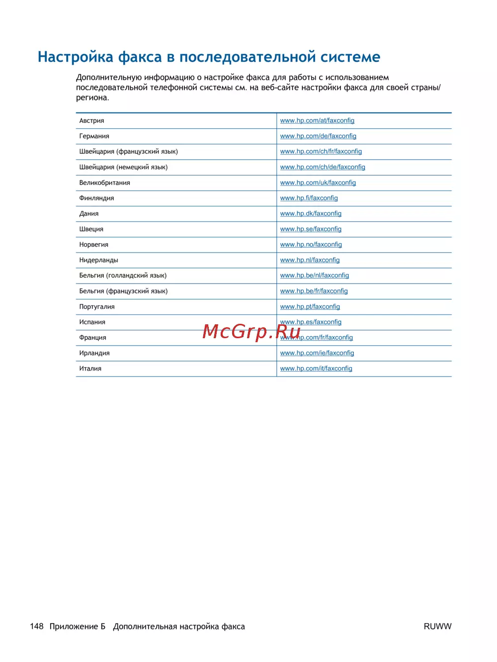 - Дополнительную информацию о настройке факса для работы с использованием последовательной телефонной системы см на веб сайте настройки факса для своей страны региона p.152