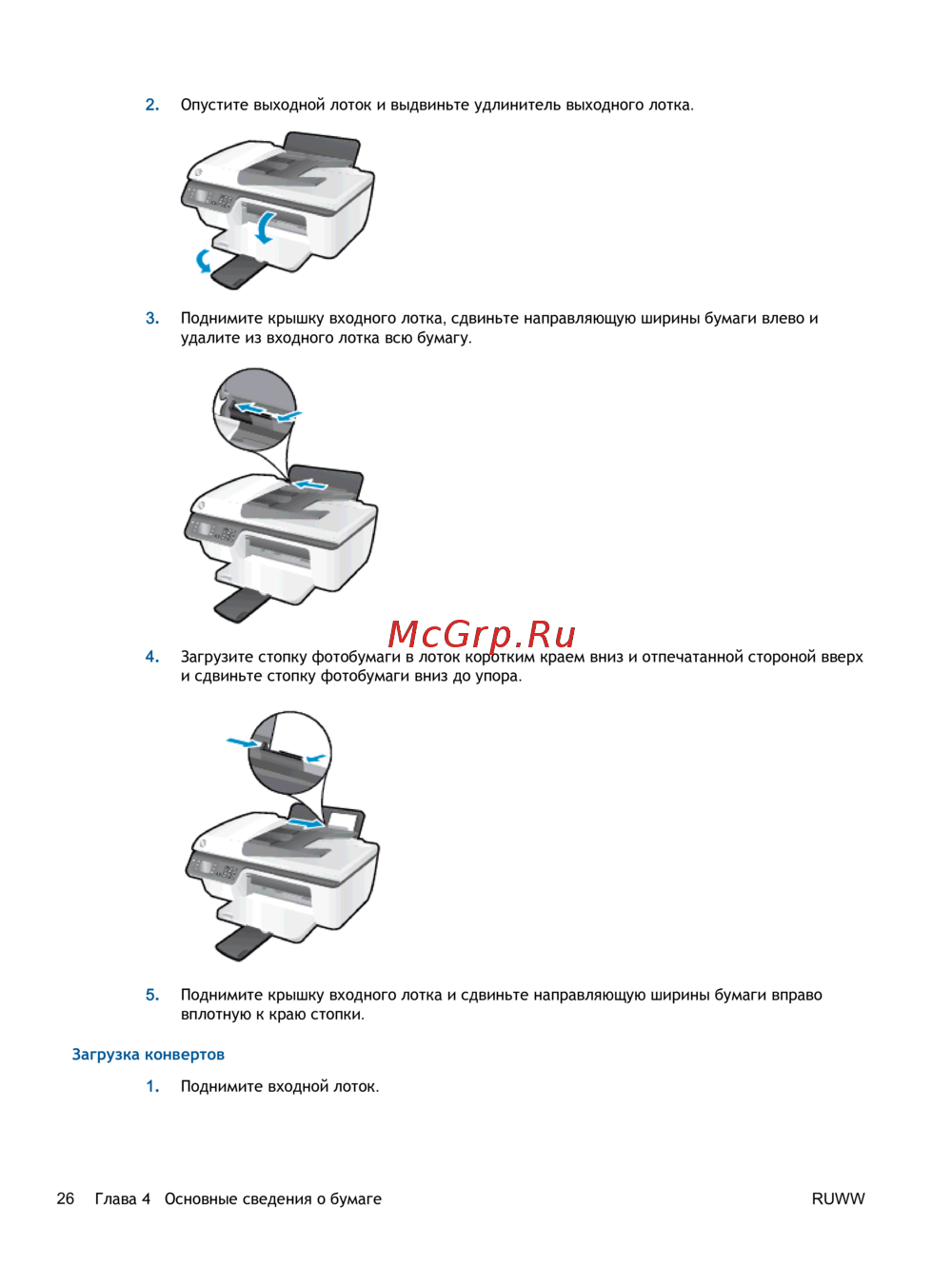 HP Deskjet Ink Advantage 2645 AIO — как правильно загружать бумагу и конверты в принтер [30/158]