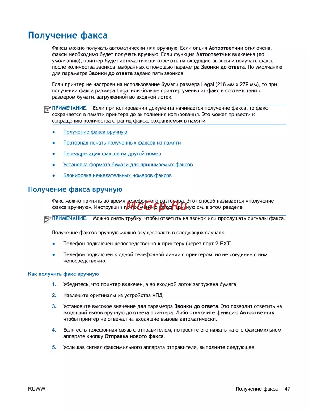 факса вручную». Инструкции по получению факса вручную см. в этом разделе.