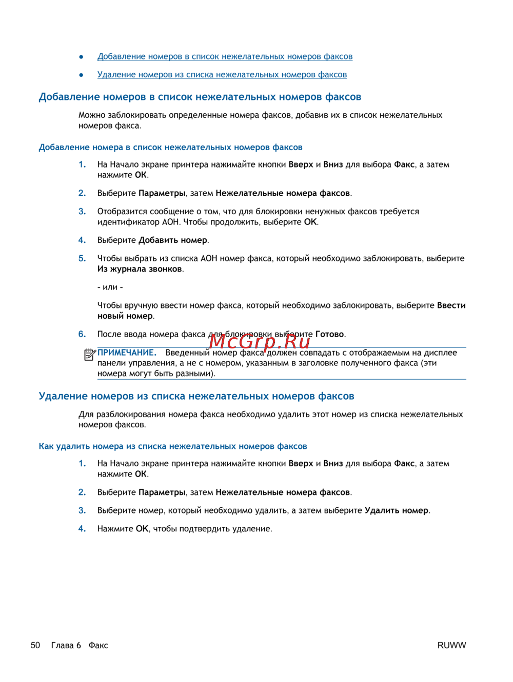 - Удаление номеров из списка нежелательных номеров факсов p.54