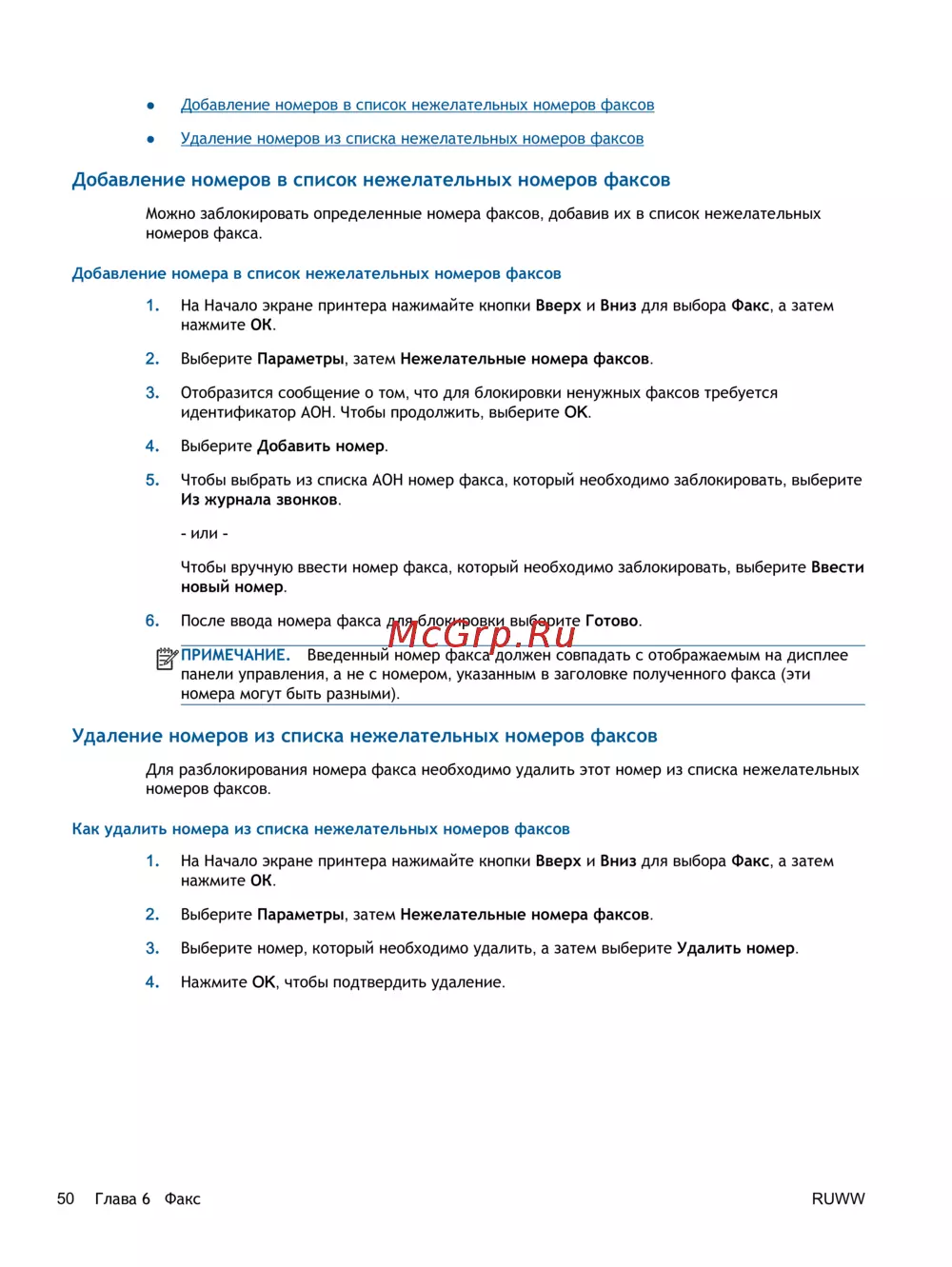 Для разблокирования номера факса необходимо удалить этот номер из списка нежелательных