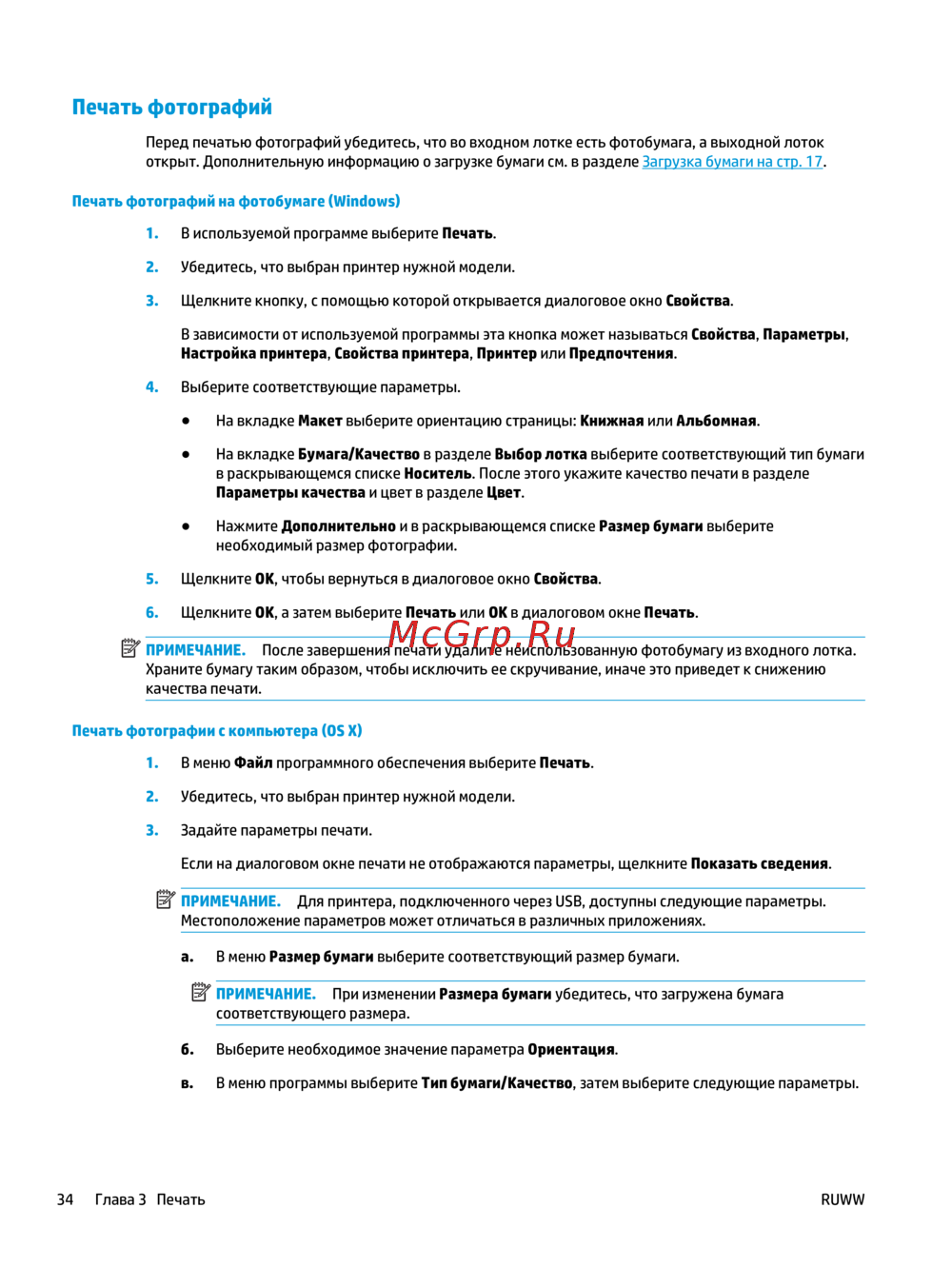 ПРИМЕЧАНИЕ. После завершения печати удалите неиспользованную фотобумагу из входного лотка.