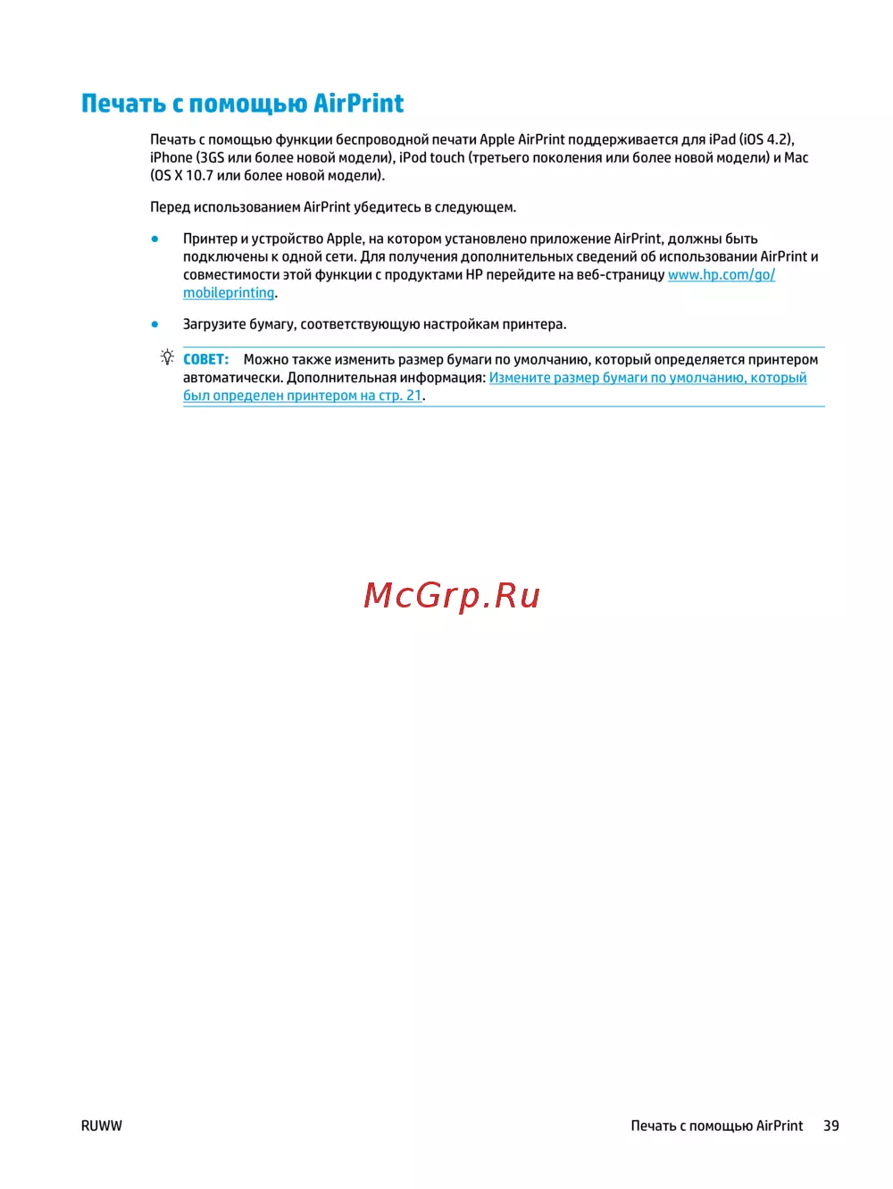 Принтер и устройство Apple, на котором установлено приложение AirPrint, должны быть