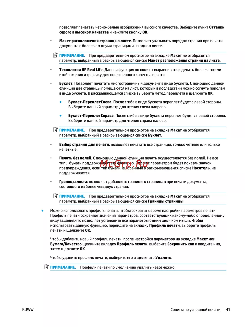 Узнайте, как печатать черно-белые изображения с высоким качеством. Используйте функции для создания буклетов, выбора страниц и настройки профилей печати.
