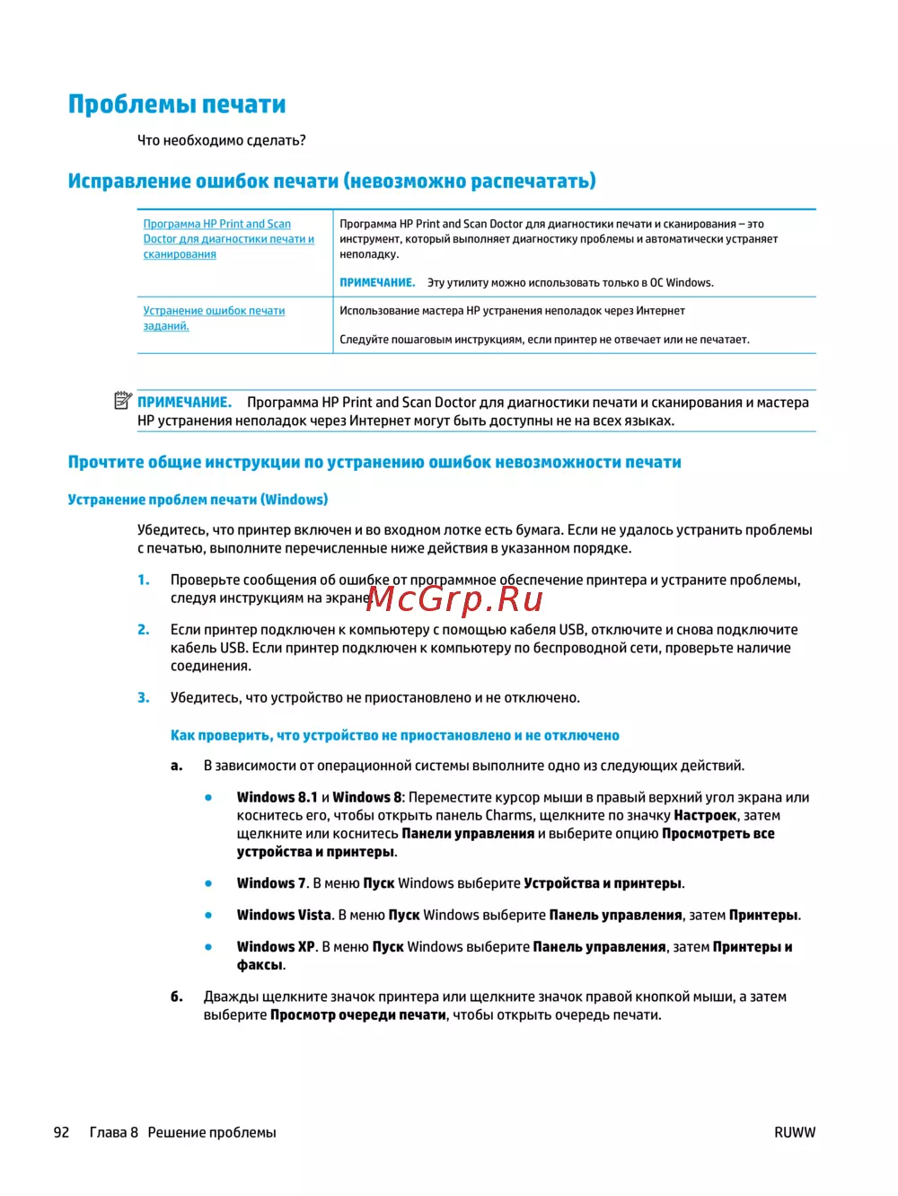 - Примечание программа hp print and scan doctor для диагностики печати и сканирования и мастера hp устранения неполадок через интернет могут быть доступны не на всех языках p.108