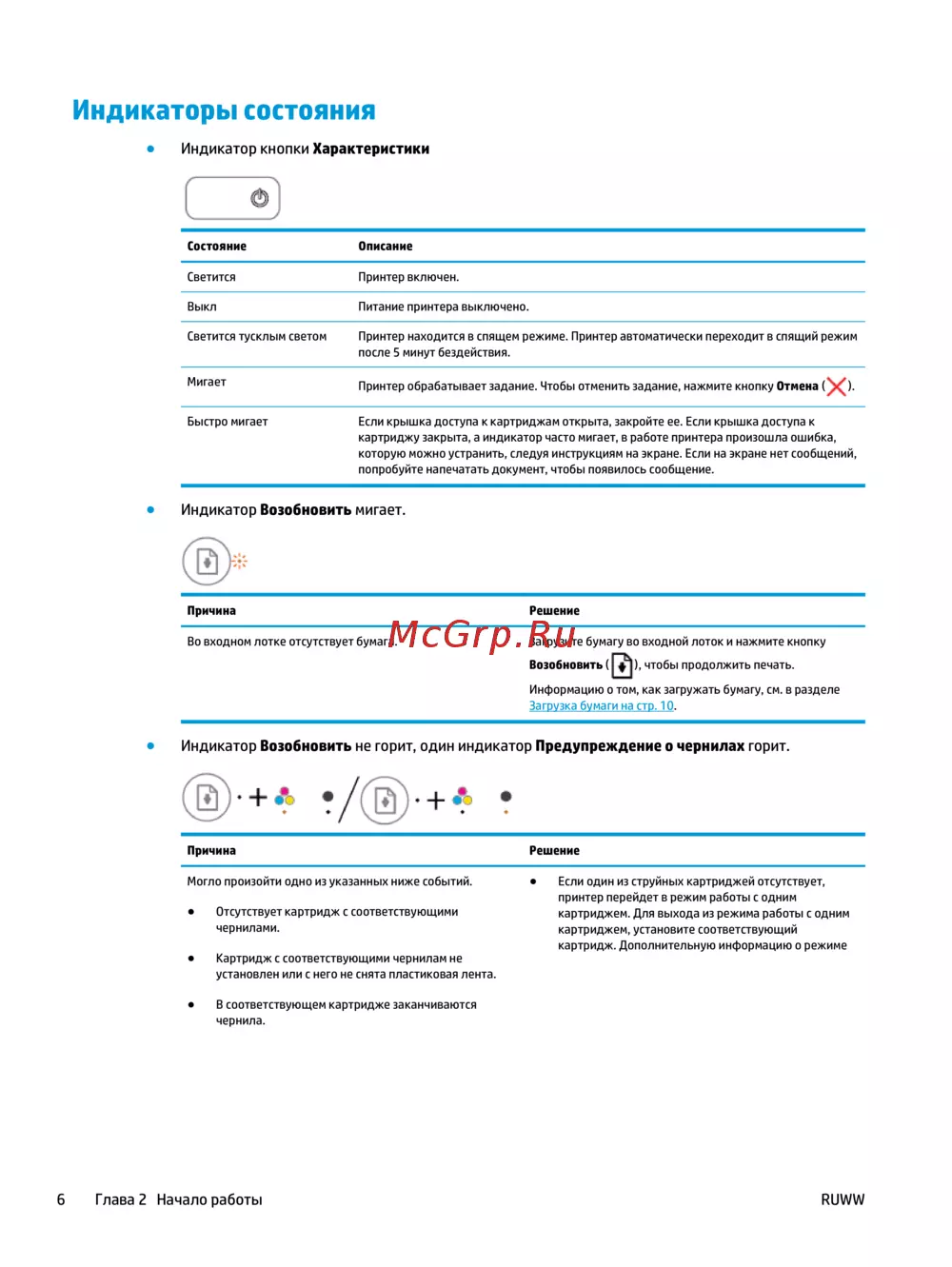 - Индикатор возобновить не горит один индикатор предупреждение о чернилах мигает p.11