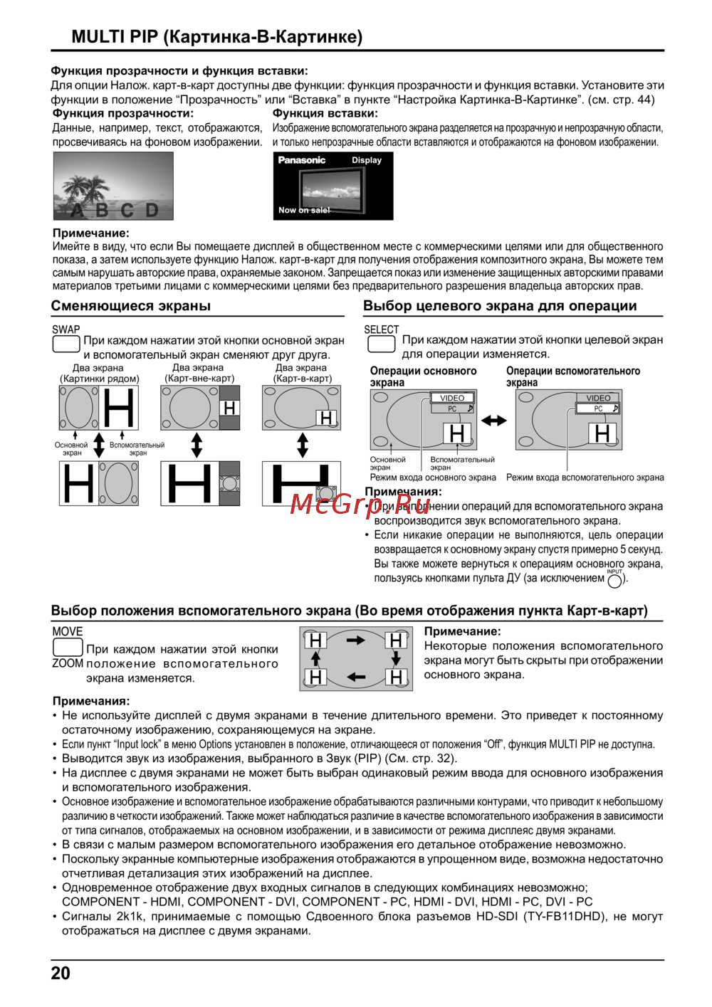 Если пункт “Input lock” в меню Options установлен в положение, отличающееся от положения “Off”, функция MULTI PIP не доступна.