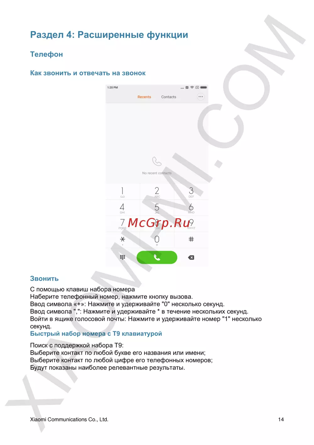 Раздел 4 Расширенные функции Телефон Как звонить и отвечать на звонок 1 20 РМ Recents Contacts No recent contacts 1 Z 4 7 0 2 Звонить С помощью клавиш набора номера Наберите телефонный номер нажмите кнопку вызова Ввод символа Нажмите и удерживайте О несколько секунд Ввод символа Нажмите и удерживайте в течение нескольких секунд Войти в ящике голосовой почты Нажмите и удерживайте номер 1 несколько секунд Быстрый набор номера с Т9 клавиатурой Поиск с поддержкой набора Т9 Выберите контакт по любой букве его названия или имени Выберите контакт по любой цифре его телефонных номеров Будут показаны наиболее релевантные результаты Xiaomi Communications Со Ltd 14