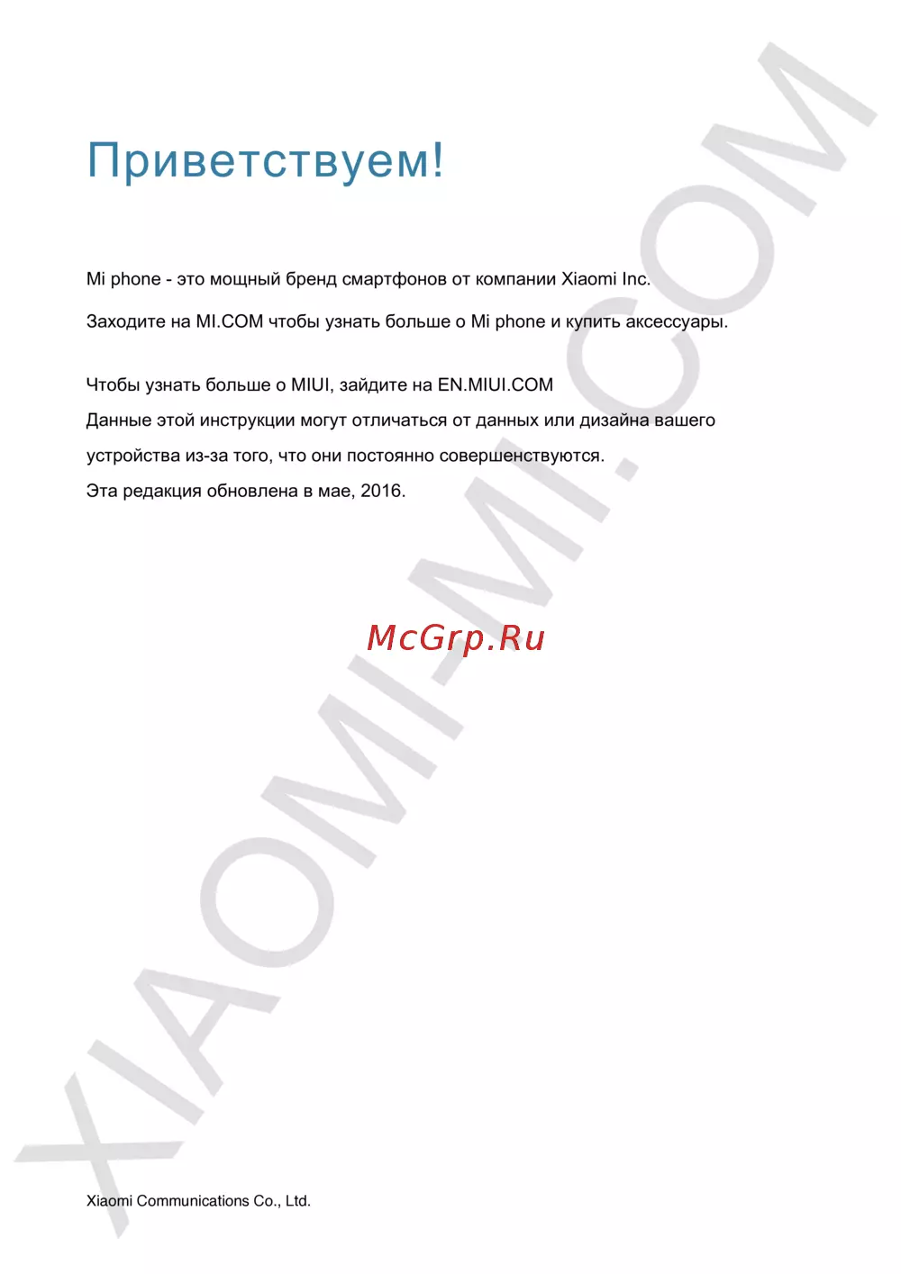 Приветствуем Mi phone это мощный бренд смартфонов от компании Xiaomi Inc Заходите на MI COM чтобы узнать больше о Mi phone и купить аксессуары Чтобы узнать больше о MIUI зайдите на EN MIUI COM Данные этой инструкции могут отличаться отданных или дизайна вашего устройства из за того что они постоянно совершенствуются Эта редакция обновлена в мае 2016 Xiaomi Communications Со Ltd