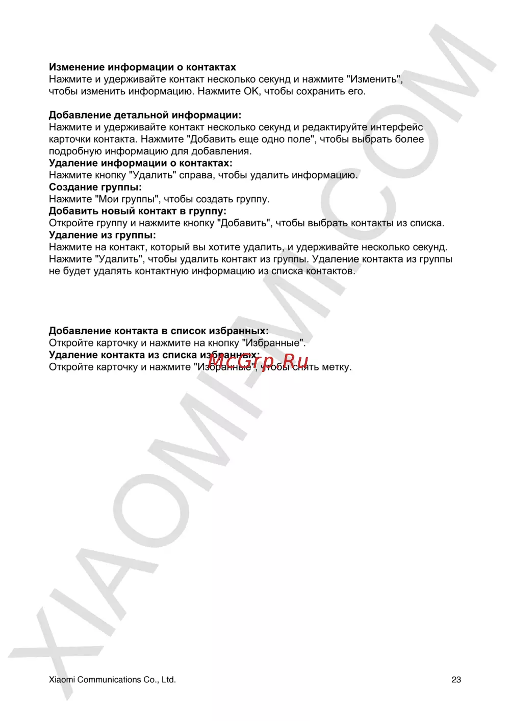 Изменение информации о контактах Нажмите и удерживайте контакт несколько секунд и нажмите Изменить чтобы изменить информацию Нажмите ОК чтобы сохранить его Добавление детальной информации Нажмите и удерживайте контакт несколько секунд и редактируйте интерфейс карточки контакта Нажмите Добавить еще одно поле чтобы выбрать более подробную информацию для добавления Удаление информации о контактах Нажмите кнопку Удалить справа чтобы удалить информацию Создание группы Нажмите Мои группы чтобы создать группу Добавить новый контакт в группу Откройте группу и нажмите кнопку Добавить чтобы выбрать контакты из списка Удаление из группы Нажмите на контакт который вы хотите удалить и удерживайте несколько секунд Нажмите Удалить чтобы удалить контакт из группы Удаление контакта из группы не будет удалять контактную информацию из списка контактов Добавление контакта в список избранных Откройте карточку и нажмите на кнопку Избранные Удаление контакта из списка избранных Откройте карточку и нажмите Избранные чтобы снять метку Xiaomi Communications Со Ltd 23