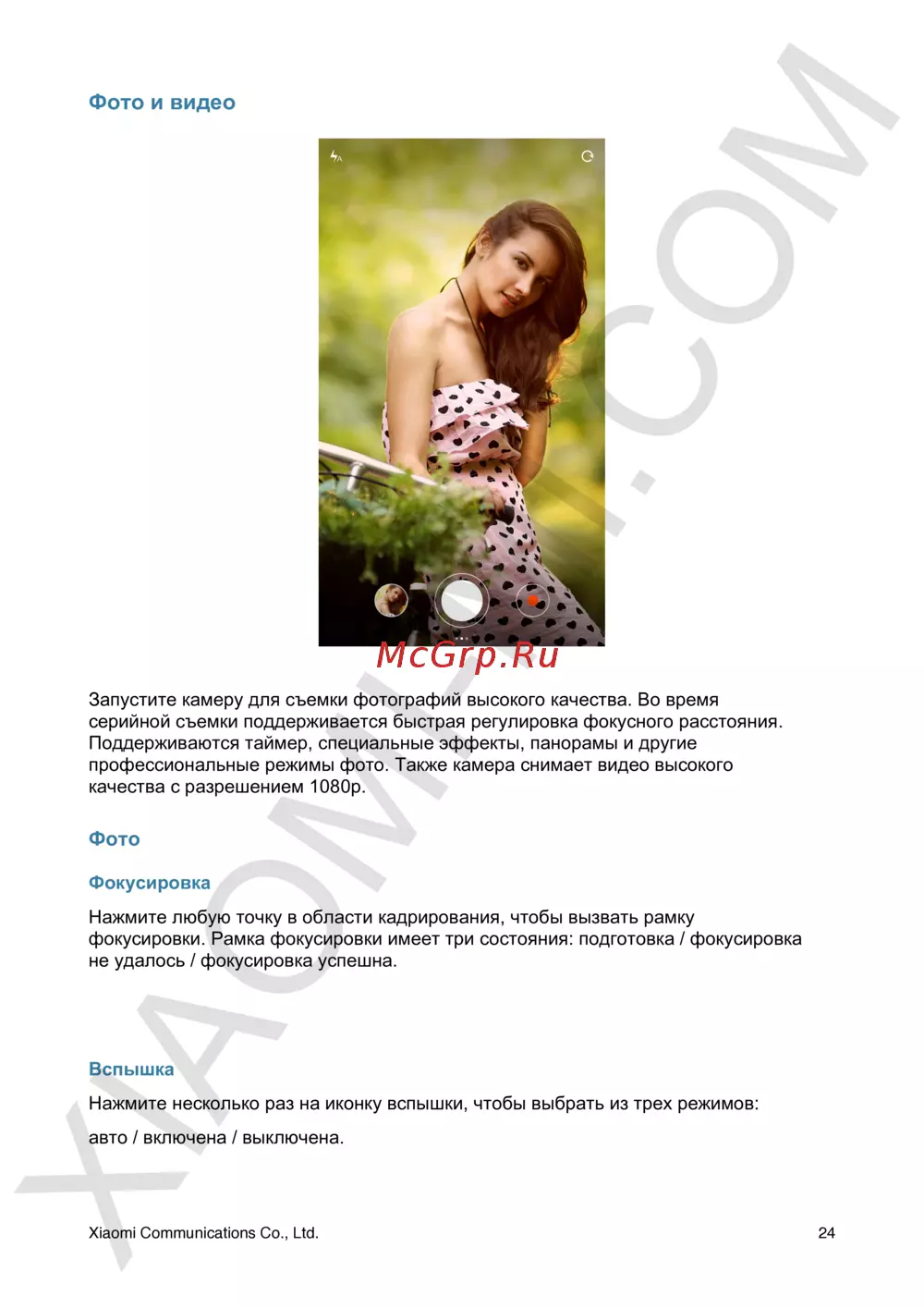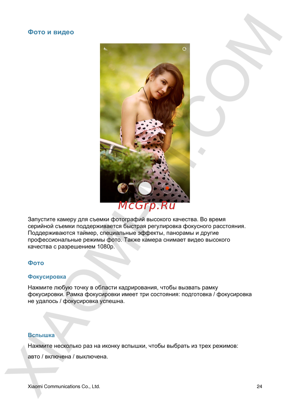 Фото и видео Запустите камеру для съемки фотографий высокого качества Во время серийной съемки поддерживается быстрая регулировка фокусного расстояния Поддерживаются таймер специальные эффекты панорамы и другие профессиональные режимы фото Также камера снимает видео высокого качества с разрешением 1080р Фото Фокусировка Нажмите любую точку в области кадрирования чтобы вызвать рамку фокусировки Рамка фокусировки имеет три состояния подготовка фокусировка не удалось фокусировка успешна Вспышка Нажмите несколько раз на иконку вспышки чтобы выбрать из трех режимов авто включена выключена Xiaomi Communications Со Ltd 24