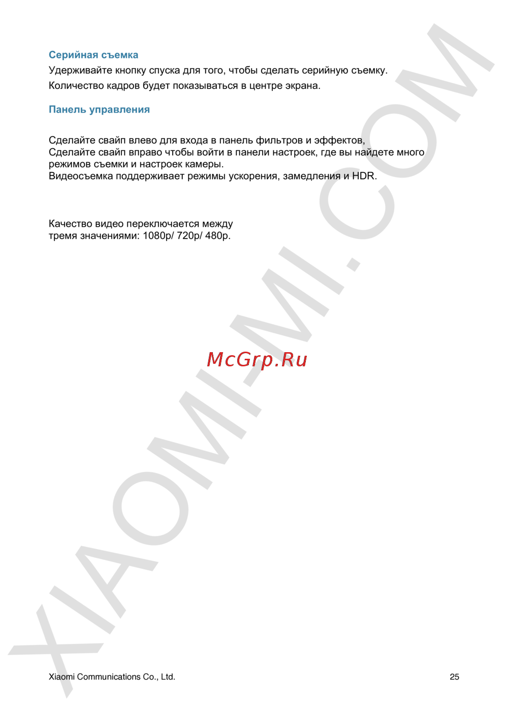 Серийная съемка Удерживайте кнопку спуска для того чтобы сделать серийную съемку Количество кадров будет показываться в центре экрана Панель управления Сделайте свайп влево для входа в панель фильтров и эффектов Сделайте свайп вправо чтобы войти в панели настроек где вы найдете много режимов съемки и настроек камеры Видеосъемка поддерживает режимы ускорения замедления и НОР Качество видео переключается между тремя значениями 1080р 720р 480р Xiaomi Communications Со Ltd 25